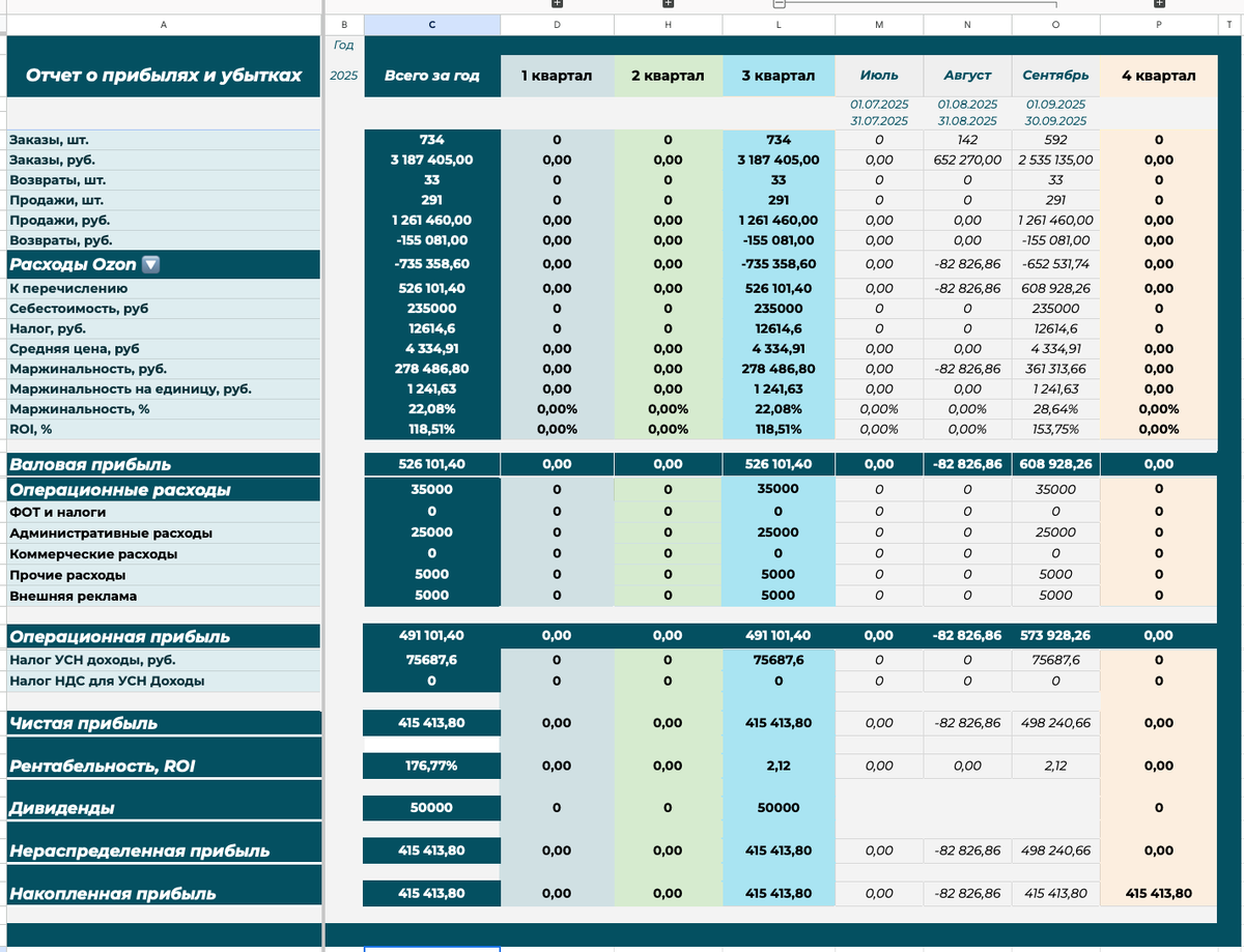 Когда я только начинал торговать на Ozon, у меня была одна и та же проблема: цифры вроде бы росли, оборот увеличивался, но прибыль куда-то исчезала. Открываю Excel, вручную вбиваю комиссии, расходы на рекламу, логистику… И каждый раз одно и то же: где-то формула сбилась, где-то цифра потерялась, и в итоге результат «пляшет». В какой-то момент я понял, что так бизнес не ведут. Нужна нормальная система — простая, понятная, которая сама считает все показатели. Так я сделал таблицу РНП для Ozon (Расчёт Прибыли и Убытков). 🔹 Воронка продаж Показывает переходы, заказы, конверсии. Видно, как реально двигается товар от клика до покупки. 🔹 Реклама под контролем DRR, CPO, CPS, бюджеты — всё считается автоматически. Таблица сразу показывает, сколько стоит заказ и стоит ли вообще лить рекламу на этот артикул. 🔹 Финансовые показатели Выручка, себестоимость, комиссии Ozon, возвраты, налоги — всё подтянуто и сведено в удобный отчёт. 🔹 P&L (прибыль и убытки) Можно смотреть картину помесячно или по