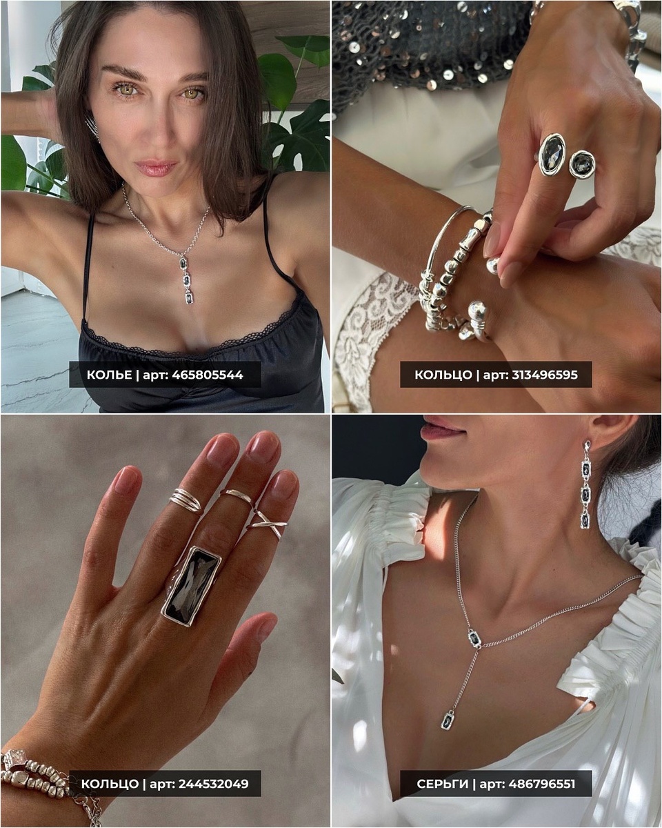 Украшения — это не просто блеск. Они корректируют пропорции, подчёркивают линию шеи, «подсвечивают» взгляд и соединяют отдельные вещи в цельный образ. На фото — четыре настроения: дымчатые кристаллы, графичная сетка, нежный жемчуг и выразительная геометрия. Ниже — подробный разбор каждой позиции строго по порядку артикулов с идеями, как носить и сочетать.