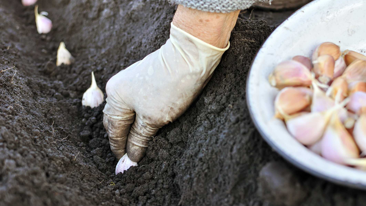 У озимого чеснока есть преимущества. Он вырастает довольно крупным и с хорошим иммунитетом к различным заболеваниям. Посев производят осенью, а урожай собирают весной. Сажают обычно его, когда температура воздуха в дневные часы опустится до +10 °С. Желательно, чтобы ночью уже были небольшие заморозки, почва должна быть мягкой и податливой. Необходимо успеть за 3 недели до постоянных морозов. За это время луковички успевают хорошо укорениться. Обычно ростки до 20 сочных корешков длиной до 7 см. Сроки сева: октябрь – ноябрь. Важный этап при выращивании культуры – подготовка семян перед посевом. Посевной материал нужно перебрать и откалибровать по размерам. Зубчики должны быть плотные, без плесени и гнили; оболочка на дольках сухая, целая и равномерно окрашенная. Высохшие, поврежденные и совсем мелкие удаляют. Также зубчики помещают в воду и убирают всплывшие. Посевной материал можно обработать от болезней. Для этого замочить их можно в водном растворе перманганата калия на 2 часа. Можно