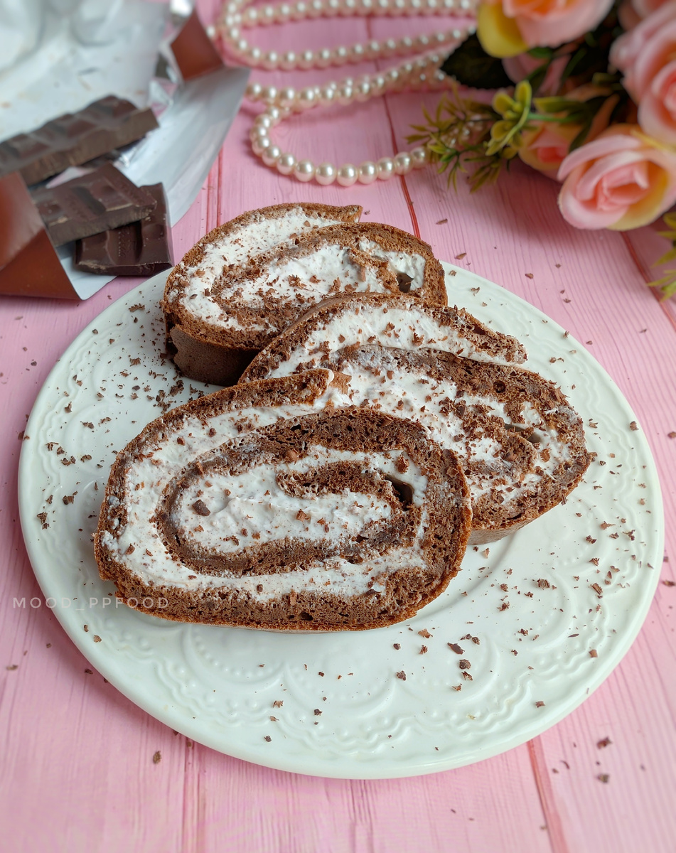 Яйцо куриное - 3 шт. Кефир 2.5% - 50 г. Мука ц/з - 40 г. Какао - порошок - 20 г. Разрыхлитель - 5 г. Подсластитель по вкусу. ▫️Для крема: Сыр творожный - 140 г. Творог мягкий 5% - 120 г. Шоколад б/с - 10 г. (У меня "Победа вкуса, горький 72%") Подсластитель по вкусу. 1️⃣ Яйца делим на белки и желтки. Белки взбиваем до крепких пиков. К желткам добавляем: 50 г. кефира, 40 г. муки, 20 г. какао - 20 г., разрыхлитель - 5 г. и подсластитель. Перемешиваем. 2️⃣ Постепенно, в несколько этапов, вводим взбитые белки в желтковую массу, перемешивая лопаткой снизу вверх. 3️⃣ Готовое тесто распределяем на силиконовом коврике и убираем в разогретую до 180° духовку на 20 минут. 4️⃣ Выпеченный коржик перекладываем на кухонное полотенце, осторожно снимаем силиконовый коврик или пергамент, сворачиваем в рулет и остужаем. 5️⃣ Для крема смешиваем: 140 г. творожного сыра, 120 г. мягкого творога и подсластитель по вкусу. 6️⃣ Натираем на мелкой тёрке шоколад, добавляем в крем и перемешиваем. 7️⃣ Получ