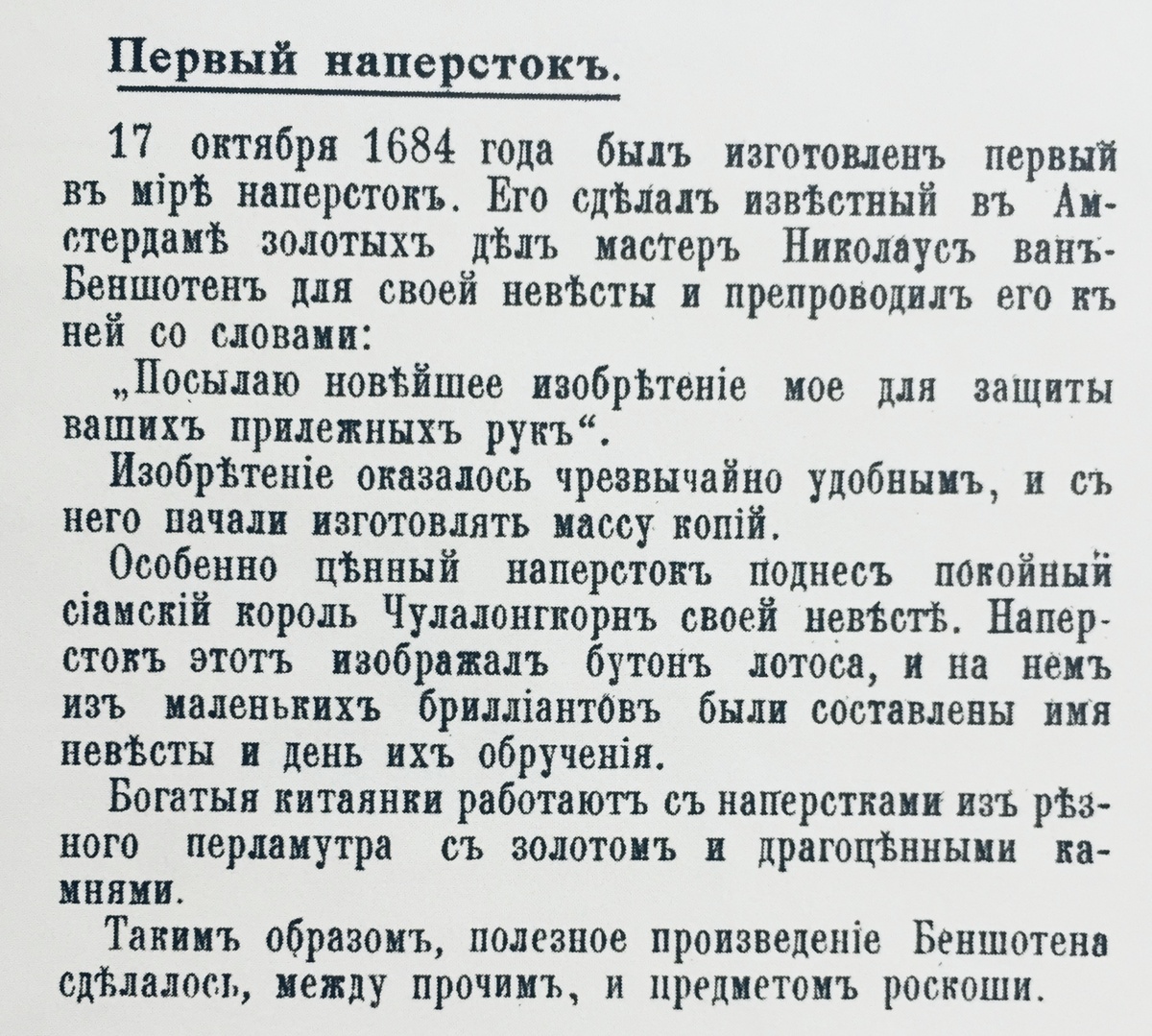 Практически во всех газетах мира на рубеже 19-20 веков упоминается некий «напёрсток королевы Сиама, усыпанный бриллиантами и другими драгоценными камнями». Вот, например, из российской дореволюционной газеты, к сожалению, датировки нет. Зато зато указано имя короля - Чулалонгкорн, он же Рама V, правил с 1 октября 1868 года по 23 октября 1910 года. У него было 4 жены, о которых что-то известно, 5 жен, о которых особо ничего неизвестно и 143 наложницы, так чей был напёрсток? В газете The Atchison Daily Globe от 31 мая 1889 года написано(последний абзац): «У королевы Сиама есть напёрсток из золота в форме бутона лотоса (лотос - королевская эмблема Сиама). Напёрсток густо украшен бриллиантами, складывающимися в имя королевы и дату ее свадьбы». То есть, на напёрстке было имя и даты. А латиницей или тайским алфавитом? Американская коллекционер и специалист по антиквариату Хелен Вейденфельд (Helen T. Weidenfeld) в своей статье от 13 июля 1913 года пишет об этом напёрстке следующее: «У кор