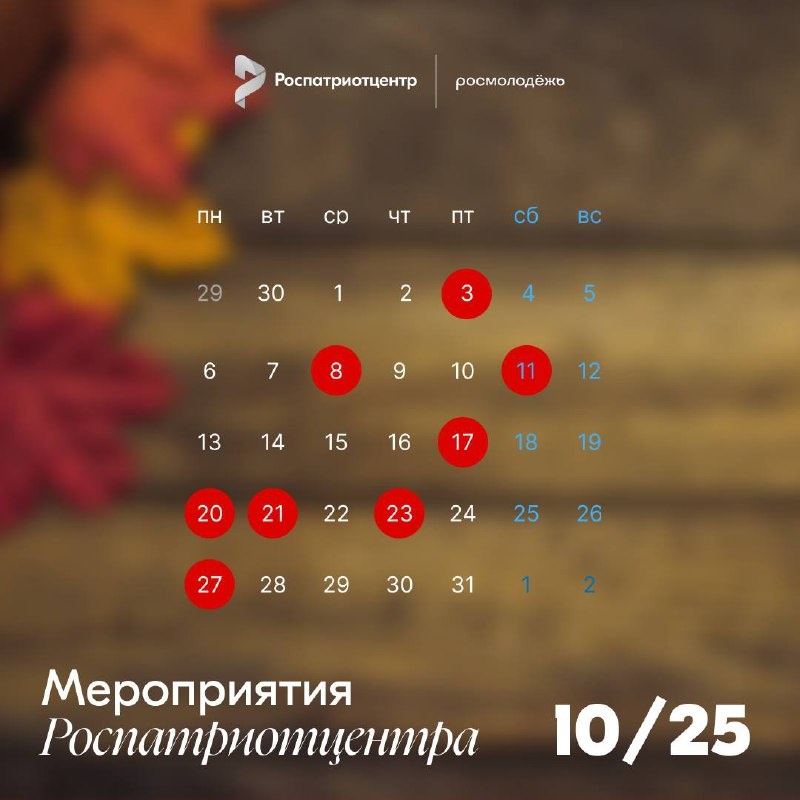 А вот и первый день октября ⤵️ Золотая осень, горячий чай и конечно же новый Календарь событий Роспатриотцентра Росмолодёжи: 🔴Начнём месяц 3 октября на Всероссийской научно-образовательной конференции «Социальный десант» в Нальчике. 🔴А продолжим 8 октября на Образовательном семинаре для молодых специалистов в сфере государственной молодёжной политики в Калуге. 🔴11 октября вновь увидим долгожданный «Горячий микрофон» из Казани на Финале Всероссийского конкурса наставников «Быть, а не казаться!-2025». 🔴8, 17 и 20 октября отправимся в путешествие с Окружными семинарами-совещаниями для специалистов по работе с молодёжью во Владивосток, Томск и Выборг. 🔴21 и 27 октября приплывём в Ялту на Духовно-просветительскую программу для молодёжи «Ливадия: главные слова о России». 🔴23 октября прилетим в Краснодар на «Форум исторического наследия». 🔴Завершим месяц 27 октября на Образовательном интенсиве «МедиаШкола» в Московской области. А ещё, вы можете стать частью этих событий: для э