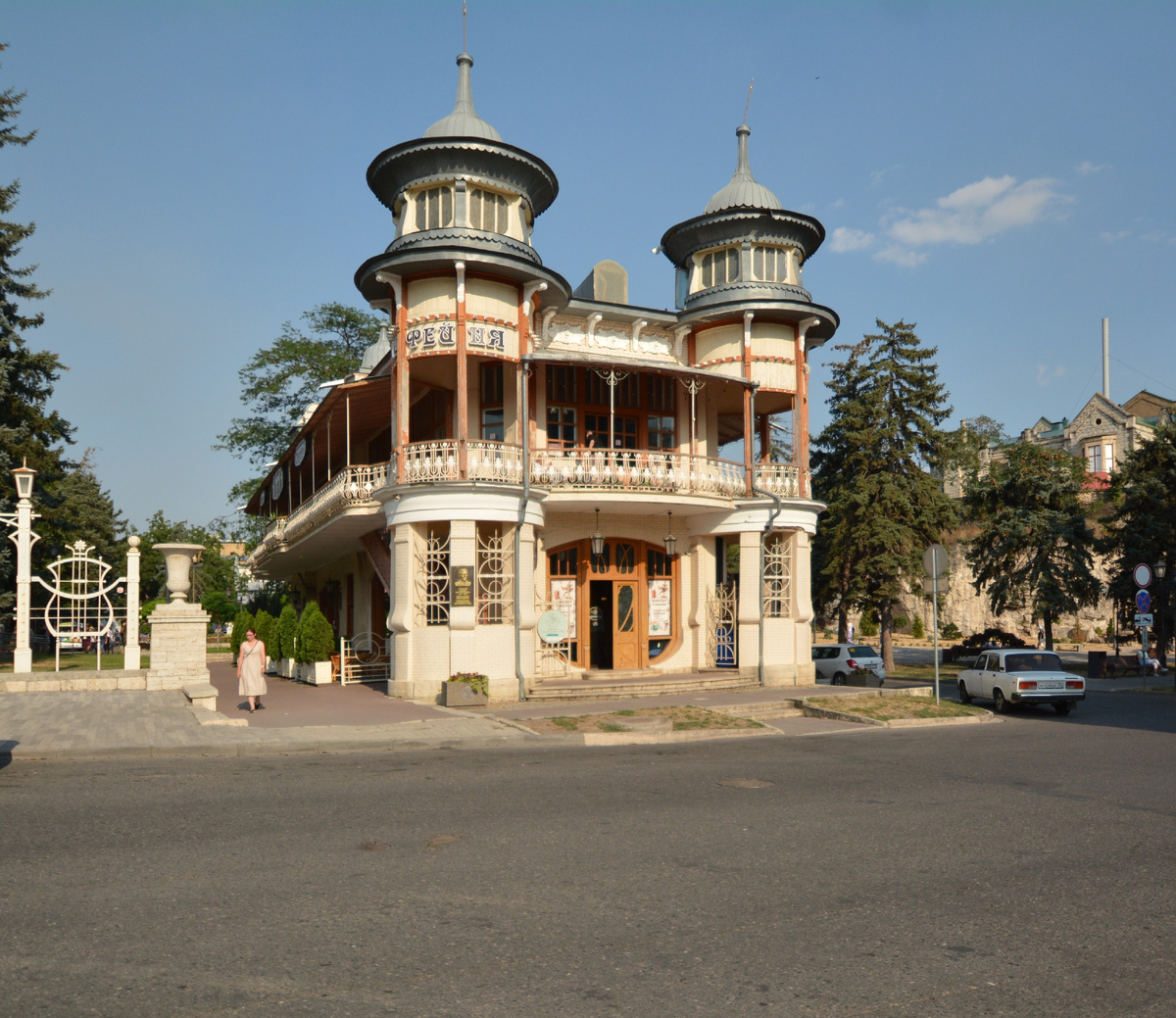 Расположено оно сразу при входе в парк «Цветник», в котором Киса просил милостыню, а Бендер назначал встречу монтёру Мечникову. С балкона второго этажа открывается прекрасный вид и на на сам парк, и на «Лермонтовскую галерею», занимающую в нём центральное место.