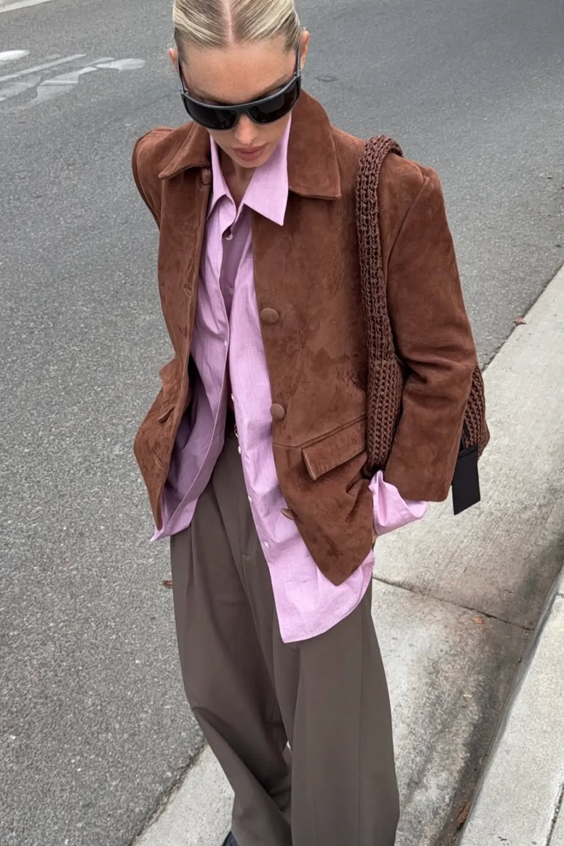В прошлом сезоне цветовая палитра была более сдержанной, отражая тенденцию к спокойной роскоши. В этом сезоне цвета стали более насыщенными, воплощая идею небрежной элегантности. Розовый, один из ведущих оттенков сезона, активно используется в различных образах. Иногда он выступает в роли монохромного решения, но также прекрасно сочетается с другими модными оттенками. Этот цвет можно увидеть на подиумах осенне-зимних коллекций 2025-2026 годов и в образах инфлюэнсеров. Давайте рассмотрим популярные комбинации розового цвета этой осенью. Коричневый – ключевой цвет осени 2025 и незаменимый оттенок для идеального сезонного гардероба. Самый популярный выбор этой осени – сочетание розовой рубашки и замшевой куртки шоколадного цвета, чтобы подчеркнуть цвет куртки. Другой вариант – можно дополнить рубашку замшевой или кожаной коричневой юбкой. Сочетание, которое на первый взгляд может показаться рискованным, идеально сочетается с розовым и желтым, создавая ультра-яркие силуэты в стиле бэби-ку