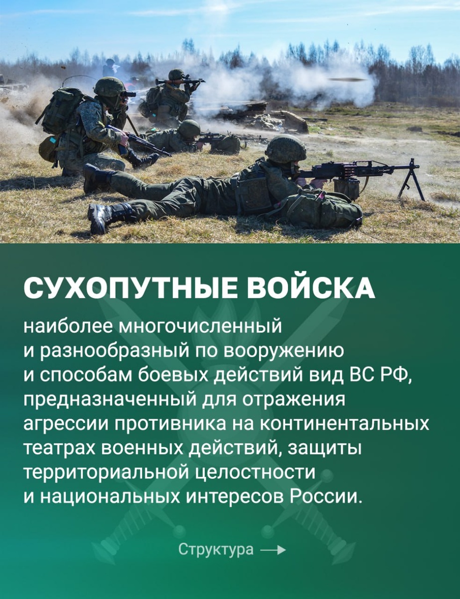Сегодня День Сухопутных войск! 🪖 Специально к празднику подготовили структуру наиболее многочисленного вида Вооруженных Сил Российской Федерации, чтобы не запутаться и поздравить всех, кто служил и служит в Сухопутных войсках. 🫡 С годовщиной, мужчины! Сухопутные войска – это сила и надёжная опора нашей страны. Поздравляем всех причастных с праздником. ————— Поддержите канал Подпиской на "Сыны Отечества" или Голосом за канал ✅ подписаться |⚡️проголосовать 📲Наш проект в социальных сетях: Вконтакте, Одноклассники, Дзен, RuTube Теперь мы и в МАХ!