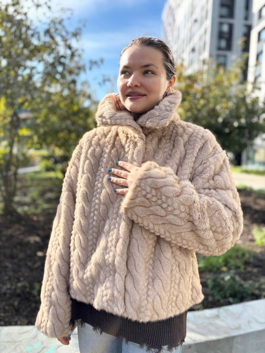 Шубка плетеной косичкой из экомеха в бежевом оттенке