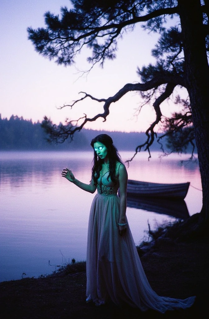 Однажды группа подростков решила проверить легенду. Они приехали на берег озера и разбили лагерь. Ночью они услышали тихий плач. Выйдя из палатки, они увидели девушку в белом платье, которая стояла у воды. Она была прекрасна, но её глаза светились неестественным голубым светом.