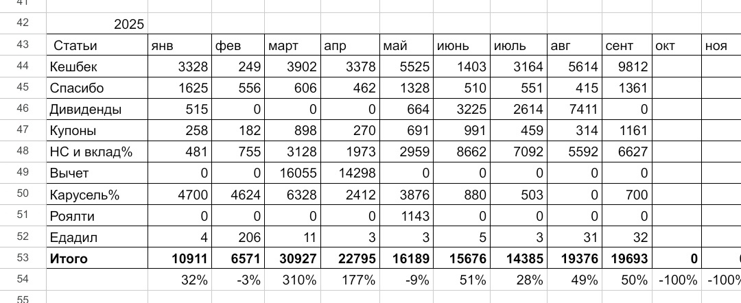 Последний раз писала почти двадцать дней назад. Сначала и времени не было, а потом и сил. В общем, мы переехали в Москву 😆 как и писала ранее, с югом и Майкопом история закончилась 🤷♀️ мы снова гораздо севернее и в столице. Переехали мы 15 сентября (2 недели назад), но про переезд сам и про первые дни на новом месте напишу отдельно, как полностью соберусь с мыслями, но в этот раз переезд дался весьма тяжеловато. И морально, и финансово, и физически. Видимо, я всё таки старею 🤦♀️😆 ладно, мои мысли и впечатления о том, как всё изменилось в городе за 7 лет (мы жили в столице с 2018 пару лет) напишу отдельно, но я в первые дни была расстроена. Я помнила всё абсолютно другим 🤦♀️ Пассивный доход за месяц почти около 20 тысяч - 19693 р. На 50% больше, чем был в 2024 году в сентябре. Самый большой доход принесли кешбэки 👌 здесь и за оплату обучения, и за выгодные условия по заказам в жёлтом банке через город. И даже почти 3000 р кешбэк по кредитке жёлтого, компенсация бонусов за з