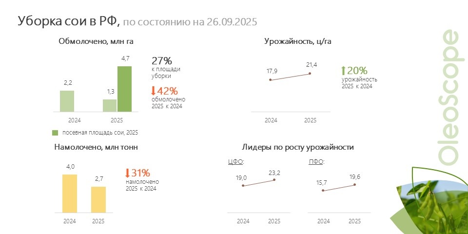 На 26 сентября в России по данным OleoScope убрано 27% площадей под соей. Цифры уборочной хоть и отстают от прошлогодних значений, но показывают самую высокую среднюю по стране урожайность в 21,4 ц/га за всю историю наблюдений. По итогам намолота собрано 2,7 млн тонн соевых бобов. Сои больше всего обмолочено в центре России — 39% и 794 тыс. га, что меньше, чем в прошлом году на 800 тыс. гектар. При этом, урожайность на 4,2 ц/га выше прошлогодней и составляет 23,2 ц/га, намолочено 1,8 млн тонн масличной, В Приволжье убрано 46% плановых площадей под соей или 251 тыс. га, что также меньше, чем в прошлом году на 50 тыс. га. Урожайность на 3,9 ц/га выше прошлогодних показателей и составила 19,6 ц/га, намолочено 492 тыс. тонн бобов. На Юге России убрано более половины площадей под культурой — 57% или 115 тыс. га, на 74 тыс. га меньше, чем в прошлом году. Намолочено 134 тыс. тонн бобов, урожайность выше прошлогодней на 0,7 ц/га и составила 11,6 ц/га. Всего культура собрана с 1 272 тыс. га п