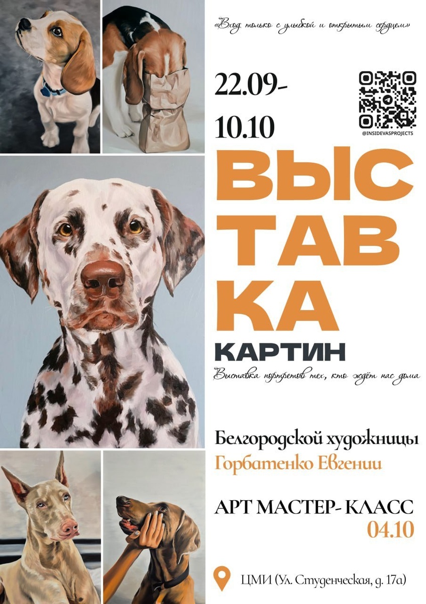 Выставка портретов тех, кто всегда с нетерпением ждёт нас дома 🥹 Догадались, о ком идёт речь? Конечно же, о наших любимых «хвостиках»! #идёмбесплатно в любой день до 10 октября на выставку Горбатенко Евгении «Мокрый нос и тёплый взгляд» в ЦМИ по адресу: г. Белгород, ул. Студенческая, 17а ➡️Вход только с улыбкой 💬«Выставка о тех, кто делает нашу жизнь ярче одним своим присутствием. О тех, кто встречает нас у порога с радостью в глазах, о безусловной любви и доверии, которые невозможно подделать», — отметили организаторы. В экспозиции представлены не просто изображения домашних любимцев, но и их характеры, эмоции и внутренний мир, воплощённые кистью художника. ✍️ Кстати, 4 октября в 12:00 Евгения проведёт мастер-класс по рисованию, чтобы каждый мог попробовать себя в искусстве. Не пропустите! Не забудьте подписаться на наш канал ❤️
