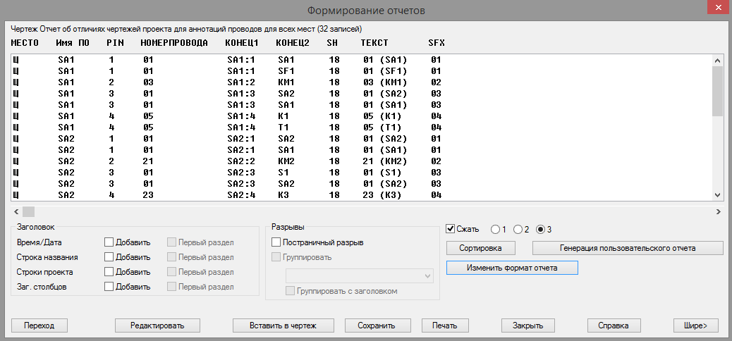 Этот отчет обрабатывает аннотации проводов выбранных компоновочных образов. Каждая строка отчета содержит информацию о непарной точке подключения. На панели «Монтажная панель» вкладки «Отчеты» запускаем команду «Отчеты». В диалоговом окне «Отчеты по монтажным панелям» выбираем отчет с именем Исключение для аннотации проводов и настраиваем необходимые параметры. Отчет создается по всему проекту, группе выбранных чертежей и для всех компонентов активного проекта. При формировании отчета используется следующая последовательность действий: 1. Анализируются компоновочные образы на выбранных чертежах. 2. Если компоновочные образы содержит аннотации провода, то они включаются в обработку. 3. Для каждой строки аннотации провода: · Определяется компоновочный образ монтажной панели, на который существует ссылка, как на подключенный компонент. · Если компоновочный образ не содержит аннотаций проводов, которые указывают на подключенный компонент, то аннотация провода считается непарной. · Непарные