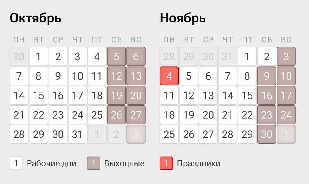 Нерабочий день переносится с субботы, 1 ноября, на понедельник, 3 ноября. Таким образом, со 2 по 4 ноября граждан ждут выходные, приуроченные ко Дню народного единства.