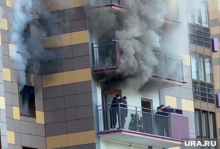 Согласно опубликованным фотографиям, дым идет из квартиры в районе девятого этажа. Несколько человек вышли на балкон.
