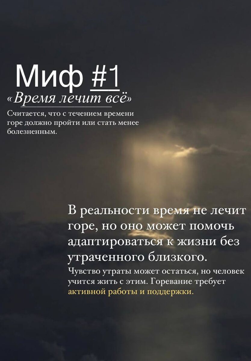 В какой-то момент мы утратили знание о том, что такое горе. Мы забыли о том, как его проживать самим и помогать переживать это страшное время нашим близким. Мы наделили неизбежную часть нашей жизни множеством глупостей и мифов, которые могут сбивать с толку людей, переживающих утрату, а также тех, кто старается их поддержать. Я собрал несколько распространённых мифов, которые важно развенчивать. Потому что эти мифы могут создавать ненужное давление на тех, кто переживает утрату, и мешать людям выражать свои чувства естественно. Развенчание таких мифов помогает понять, что горевание — это индивидуальный и многогранный процесс, который не имеет универсальных правил. Некоторые уверены, что горе — удел исключительно женщин, чьи сердца, естественно, склонны к чрезмерной чувствительности и слезам. В их представлении, все, кто переживает утрату, должны пребывать в вечном печальном настроении, выражая свою боль посредством невиданных страданий и слёз, как если бы лишь таким образом можно