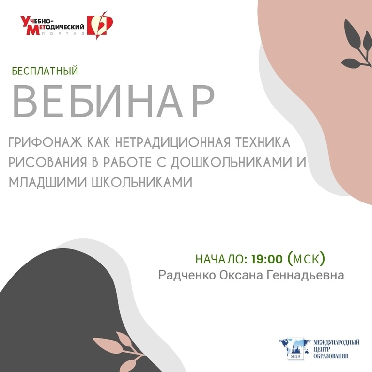 Вебинар «Грифонаж как нетрадиционная техника рисования в работе с дошкольниками и младшими школьниками» Дата проведения: 02.10.2025 Начало: 19:00 (МСК) https://www.uchmet.ru/events/item/3956104/ На вебинаре слушатели вместе с ведущим рассмотрят основы развития изобразительных умений у детей дошкольного и младшего школьного возраста средствами необычного способа рисования – грифонажа или каракулей. Содержательные вопросы вебинара: 1. Грифонаж как одна из нетрадиционных техник изобразительной деятельности для детей дошкольного и младшего школьного возраста. 2. Обзор необходимых материалов для рисования. 3. Этапы создания наброска с использованием техники выполнения рисунка-грифонажа. 4. Организация и проведение занятий с использованием техники «Грифонаж» для детей дошкольного и младшего школьного возраста. Ведущий вебинара: Радченко Оксана Геннадьевна, заместитель руководителя Центра духовно-нравственного воспитания и художественного творчества Волгоградского государственного аграрно