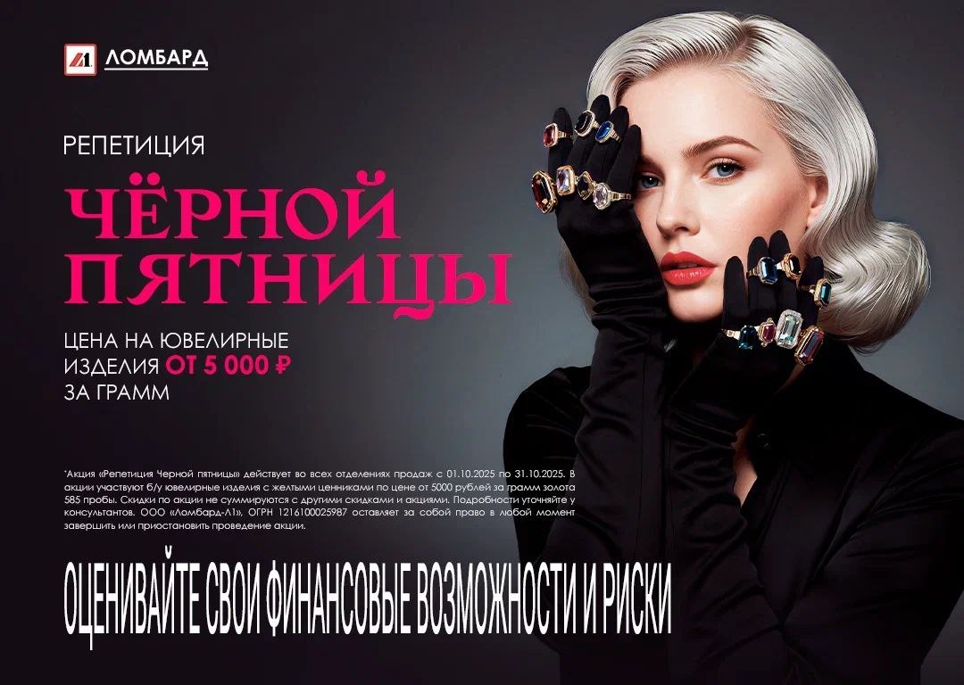 Не ждите 11.11! 🔥 Наша "Черная пятница" стартует уже в октябре! Изысканные ювелирные украшения доступны по цене от 5000 рублей за грамм! Это идеальное время, чтобы пополнить вашу коллекцию сияющими новинками по самым выгодным ценам! Не упустите свой шанс! Акция «Репетиция Черной пятницы» действует во всех отделениях продаж с 01.10.2025 по 31.10.2025. В акции участвуют б/у ювелирные изделия с желтыми ценниками по цене от 5000 рублей за грамм золота 585 пробы. Скидки по акции не суммируются с другими скидками и акциями. Подробности уточняйте у консультантов. ООО «Ломбард-Л1», ОГРН 1216100025987 оставляет за собой право в любой момент завершить или приостановить проведение акции. ОЦЕНИВАЙТЕ СВОИ ВОЗМОЖНОСТИ И РИСКИ