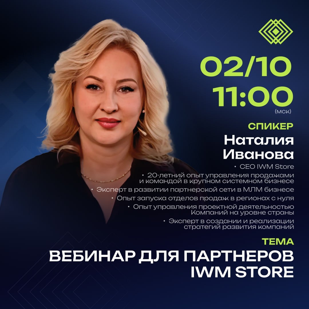 ✉️🚨2 октября, 11:00 (четверг). Наталья Иванова, CEO IWM Store, будет взламывать ваш подход к продажам и партнерству. Что вас ждет? ✔️Узнаете, как переписать вашу презентацию так, чтобы клиенты сами тянулись к вам. Нет, мы не про магию. Про логику, которая цепляет. ✔️Узнаете, как IWM Store становится не просто “еще одной возможностью”, а реальным драйвером вашего дохода. Партнерство, которое приносит ощутимые результаты. 🔔🎙Cпикер: ✨ Иванова Наталья — CEO IWM STORE. (Человек, который знает, как сделать так, чтобы работало). Если хотите, чтобы ваши усилия приносили результат — приходите. Если вас всё устраивает — тогда вам не сюда. Когда: 2 октября, 11:00. Где: ZOOM. P.S. Время идет. Выбор — за вами. Ссылка для входа: 👇 https://us06web.zoom.us/j/2116731674?pwd=xahqmhZLmGsNMAcfVYG8sNdiNWlLRY.1