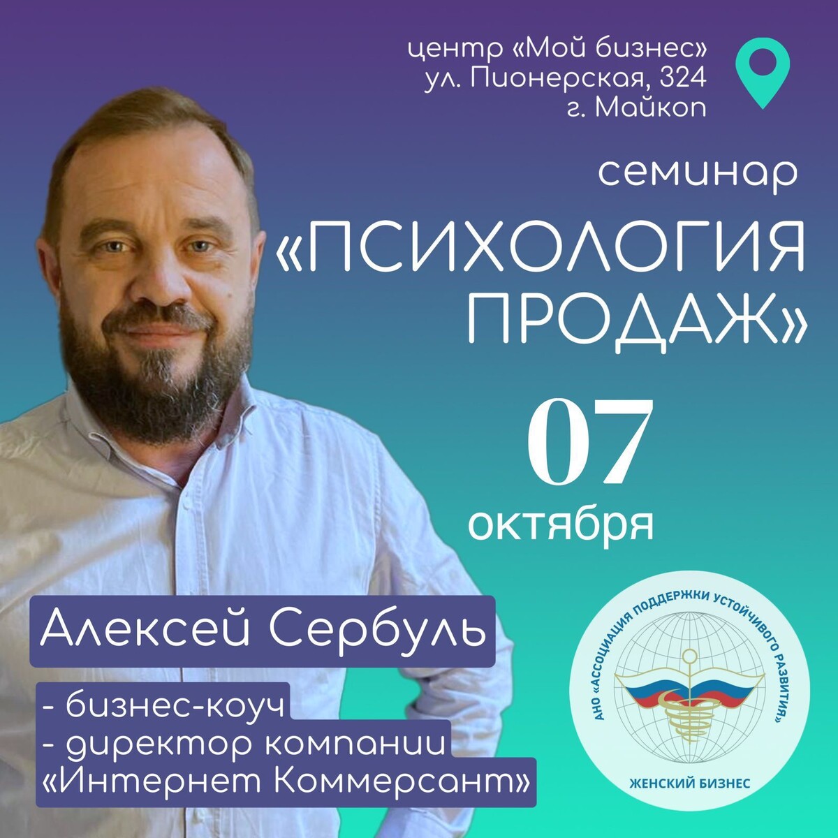 Психологию принятия решений о покупке предприниматели Адыгеи узнают на семинаре 7 октября Центр «Мой бизнес» Адыгеи организует бесплатный очный семинар на тему «Психология продаж: как клиенты принимают решение о покупке». Его будет вести федеральный спикер Алексей Сербуль - бизнес-консультант и тренер по продажам с 15-летним опытом. Приглашаются предприниматели региона, а также физлица, планирующие открыть дело в Адыгее. Его участники получат ответы на вопросы о том, как с разговаривать с «эмоциональным мозгом» клиента, чтобы он сам захотел купить, почему 90% возражений от партнера возникают из-за ошибок в подаче коммерческого предложения, какие подсознательные установки владельца бизнеса блокируют рост продаж, а также какие практические техники в разговора с клиентом помогут поменять к лучшему его отношение к покупке. Регистрация - по ссылке: https://clck.ru/3PVh5N Отметим, семинар организуется по нацпроекту «Эффективная и конкурентная экономика».