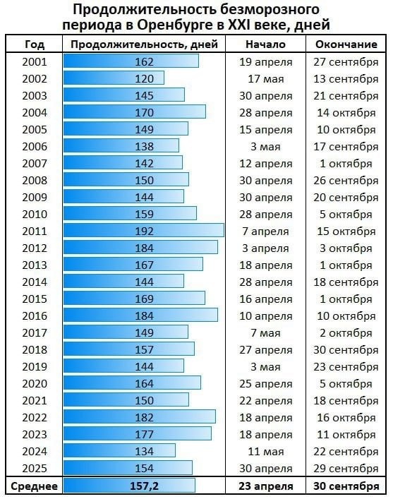 В Оренбурге завершился самый длинный тёплый период года. Он длился с 30 апреля по 29 сентября — ровно 154 дня. Это всего на три дня меньше среднего показателя за последние два десятилетия.
