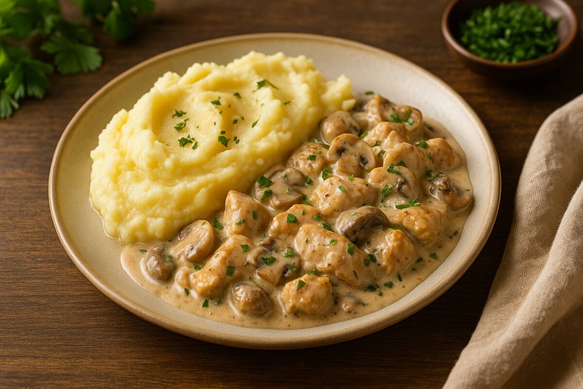 «Мам, только не просто жареную курицу!» — сказала дочка, когда я достала из холодильника филе. В этот момент я поймала себя на мысли, что и правда: иногда нам кажется, что одно и то же блюдо уже приелось. Но стоит добавить грибы, немного сливок и зелени — на столе оказывается совсем другой ужин. Простой, домашний, но с ноткой ресторанного вкуса. Вот за такие маленькие превращения я и люблю кухню. Курица в сливочно-грибном соусе — это рецепт, который легко подстраивается под ситуацию. Универсальность здесь в том, что один рецепт работает для будней, гостей и даже романтического ужина. Ингредиенты (на 4 порции): • Куриное филе или бедро без кости 600 г • Шампиньоны или вешенки 300 г • Лук репчатый 1 шт. • Сливки 20% 250 мл • Масло сливочное 30 г • Масло растительное 2 ст. л. • Мука 1 ч. л. • Чеснок 2 зубчика • Соль, перец по вкусу • Петрушка или укроп для подачи 1. Подготовка курицы. Филе нарежьте крупными кусочками (по 3–4 см). Обсушите бумажным полотенцем, чтобы при обжарке не выделя