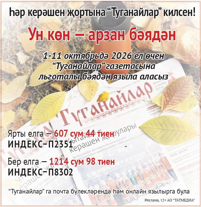 Дусларыбыз, карендәшләребез! ❤ ⚡️ 1-11 октябрь льготалы подписка бара ☀️"Туганайлар"га Татарстанда һәм Россиянең башка төбәкләрендә дә язылырга була! 📌Татарстанда онлайн язылу өчен ссылка: 👉 podpiska.pochta.ru/press/П2351 ❗Почтада чират көтеп торасыгыз килмәсә, 8 917 250 97 95 номерына языгыз. Бик тиз генә подписка ясап бирербез❗ 🎁🎈 Язылучылар арасында бүләкләр дә уйначакбыз! Квитанцияләрне 8 917 250 97 95 номерына кабул итәбез @tuganaylar_2002