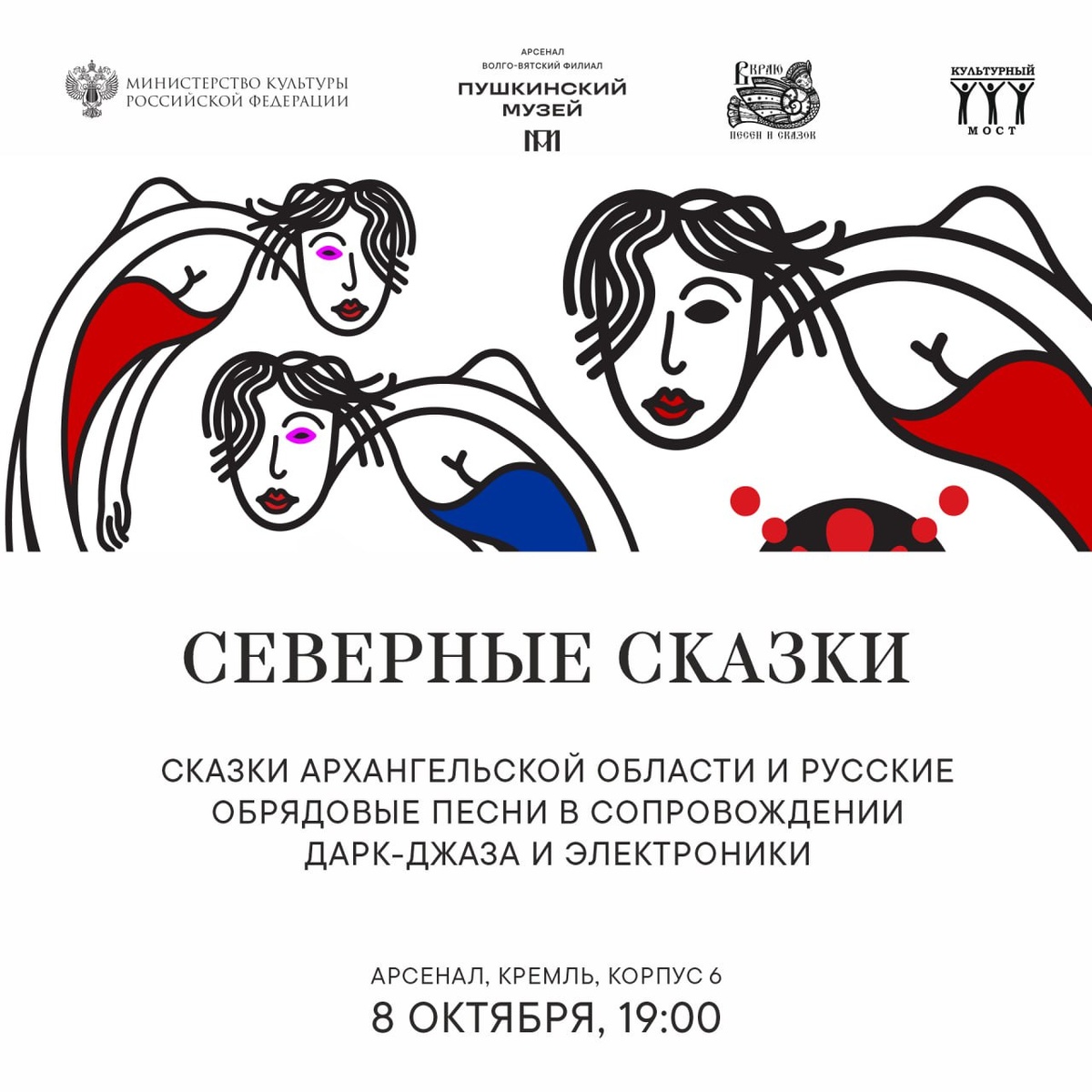 Концерт «Северные сказки» — 8 октября в 19:00 Как современные музыканты исследуют глубинные связи между музыкой самых разных направлений и фольклором? Почему современные исполнители обращаются к народному песенному и сказочному наследию? И что из этого может получиться? Приходите в Волго-Вятский филиал Пушкинского музея, чтобы узнать ответы на эти вопросы. В этом помогут ваши любимые музыканты и волшебные истории из сборника знаменитого этнографа и фольклориста Николая Ончукова «Северные сказки». В их проекте сюжетные мотивы из сказок Архангельской области переплетаются со звучанием старинных обрядовых песен, дарк-джаза, эмбиента и электроники. А на экране ожившие образы русских лубков и работы художника Дмитрия Лапшина встретятся с аватарами музыкантов-участников концерта. Музыканты, создавшие проект «Северные сказки», хорошо знакомы нашей публике по выступлениям в Арсенале: ▪️Алиса Тен (вокал) и Руст Позюмский ( фидл) — по опере «Морская дева» в финале фестиваля «Вазари» в 2022