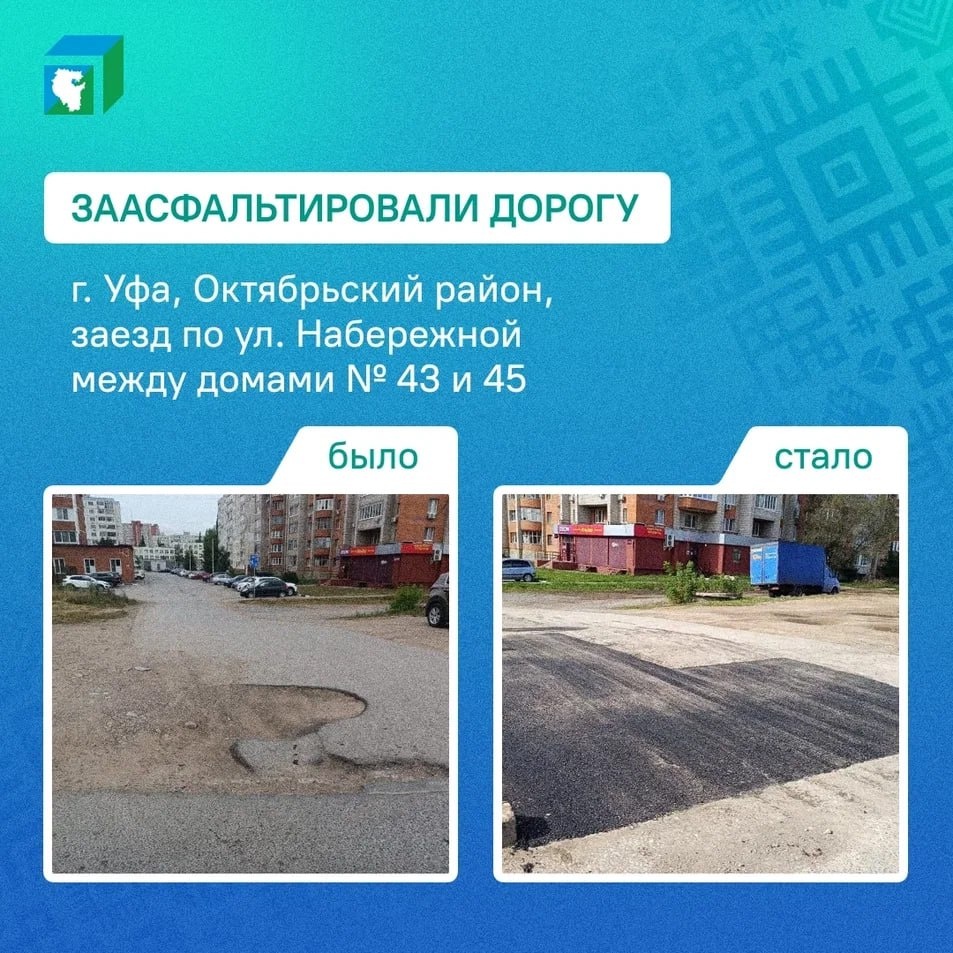 😀😃😄😁 7 сентября 2025 года автолюбительница из Октябрьского района г. Уфы в соцсетях попросила обратить внимание на состояние дороги между домами № 43 и 45 по улице Набережной и написала об этом на страницу Радия Хабирова. Специалисты Центра управления республикой зафиксировали обращение и передали в работу администрации района. О проблемном участке в ведомстве знали и ждали освобождения сотрудников коммунальных служб, которые проводили ремонт дорог на магистральных улицах. К 12 сентября заезд по ул. Набережной между домами № 43 и 45 заасфальтировали. Смотрите карточки. 💚 ЦУР Башкортостана