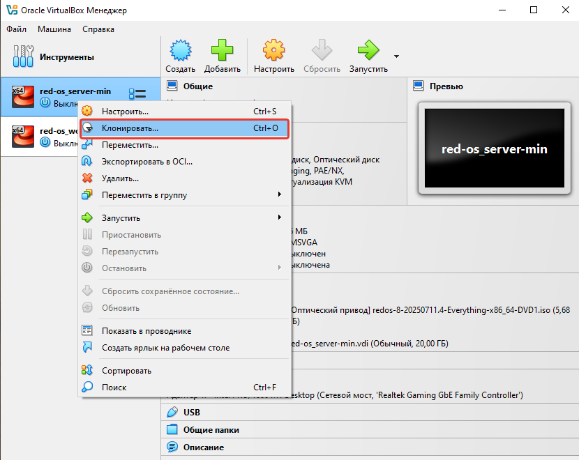 Создание ISP 1. ПКМ (правый клик мыши) по виртуальной машине red-os_server-min –> Клонировать 2. Задаем параметры новой виртуальной машины a. Имя – ISP b. Путь – указываем место хранения виртуальной машины на своем HDD c. Тип клонирование – Полное клонирование d. Политика MAC-адресов – Сгенерировать новые MAC-адреса всех сетевых адаптеров 3. Жмем «Готово» Создание HQ-RTR 1. ПКМ (правый клик мыши) по виртуальной машине red-os_server-min –> Клонировать 2. Задаем параметры новой виртуальной машины a. Имя – HQ-RTR b. Путь – указываем место хранения виртуальной машины на своем HDD c. Тип клонирование – Полное клонирование d. Политика MAC-адресов – Сгенерировать новые MAC-адреса всех сетевых адаптеров 3. Жмем «Готово» Создание BR-RTR 1. ПКМ (правый клик мыши) по виртуальной машине red-os_server-min –> Клонировать 2. Задаем параметры новой виртуальной машины a. Имя – BR-RTR b. Путь – указываем место хранения виртуальной машины на своем HDD c. Тип клонирование – Полное клонирование d