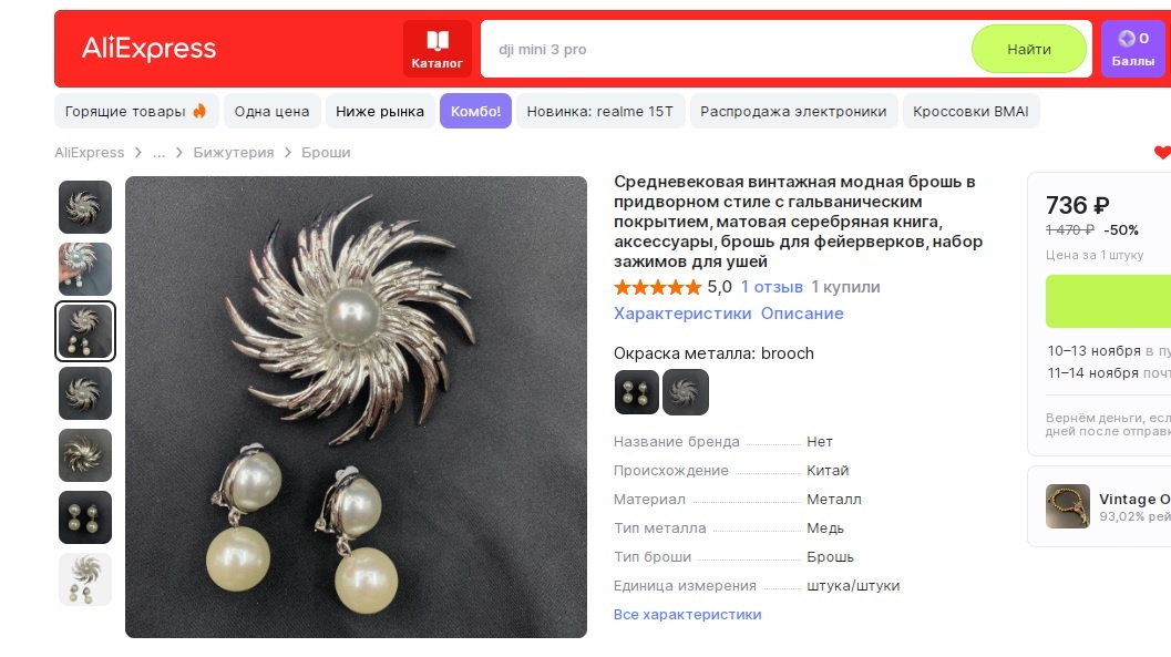 В продаже брошь. В описании информация - винтажная модная брошь. Винтажная? Это вряд ли. Здесь же представлены клипсы, по дизайну не по подходящие к броши.