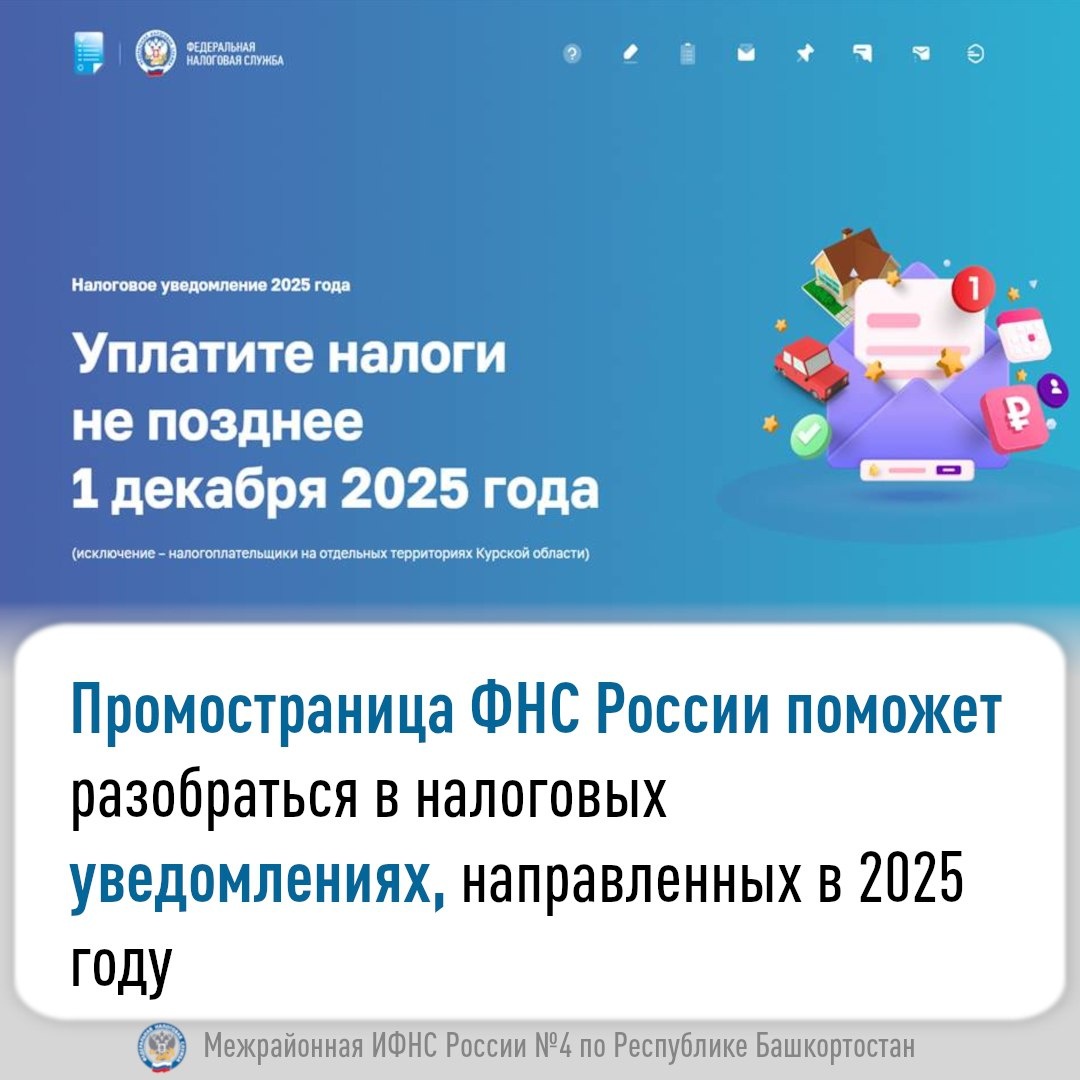 Промостраница ФНС России поможет разобраться в налоговых уведомлениях, направленных в 2025 году На сайте ФНС России размещена новая Промостраница «Налоговое уведомление 2025 года» https://www.nalog.gov.ru/nu/. Здесь налогоплательщики могут найти ответы на интересующие вопросы: что такое налоговое уведомление, как его получить и исполнить, как получить его через ЕПГУ, что изменилось в налогообложении имущества физических лиц в сравнении с прошлым периодом, как узнать о налоговых ставках, льготах и как ими воспользоваться, что делать, если налоговое уведомление не получено. Оплатить указанные в налоговом уведомлении налог на имущество физических лиц, транспортный и земельный налоги, а также НДФЛ в отношении доходов, по которым налог не удержан за 2024 год, необходимо не позднее 1 декабря 2025 года. Межрайонная ИФНС России 4 по Республике Башкортостан Источник https://uchaly102.ru/?p=102944