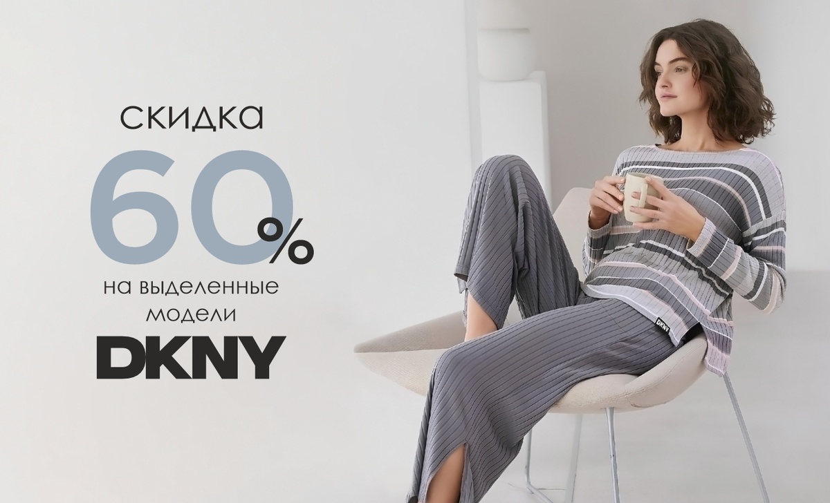 С 1 по 31 октября действует скидка 60% на выделенный ассортимент одежды DKNY для дома, сна и отдыха.