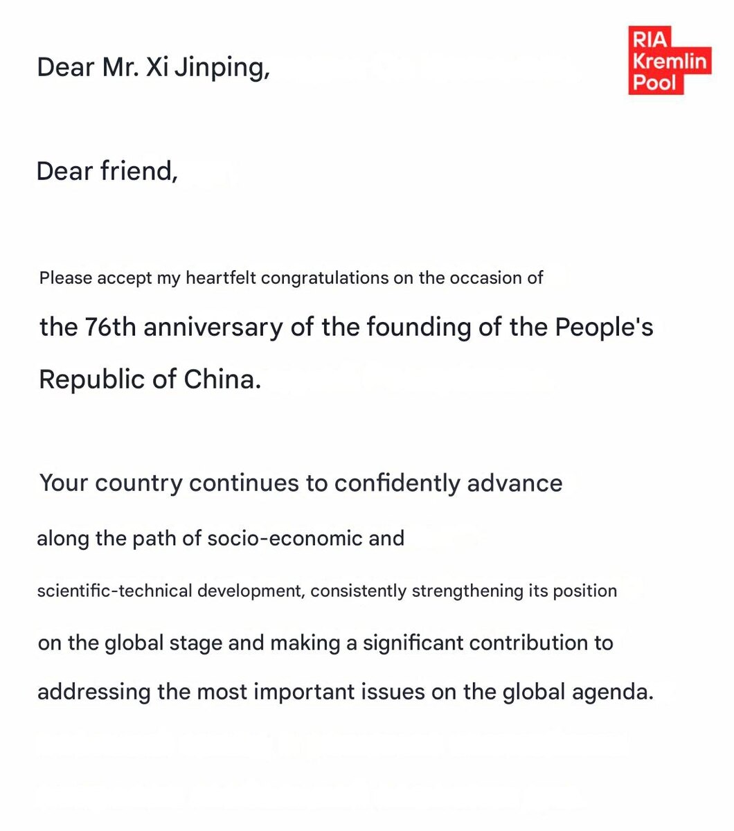 Putin sent heartfelt congratulations to Xi on 76th anniversary of the founding of People's Republic of China