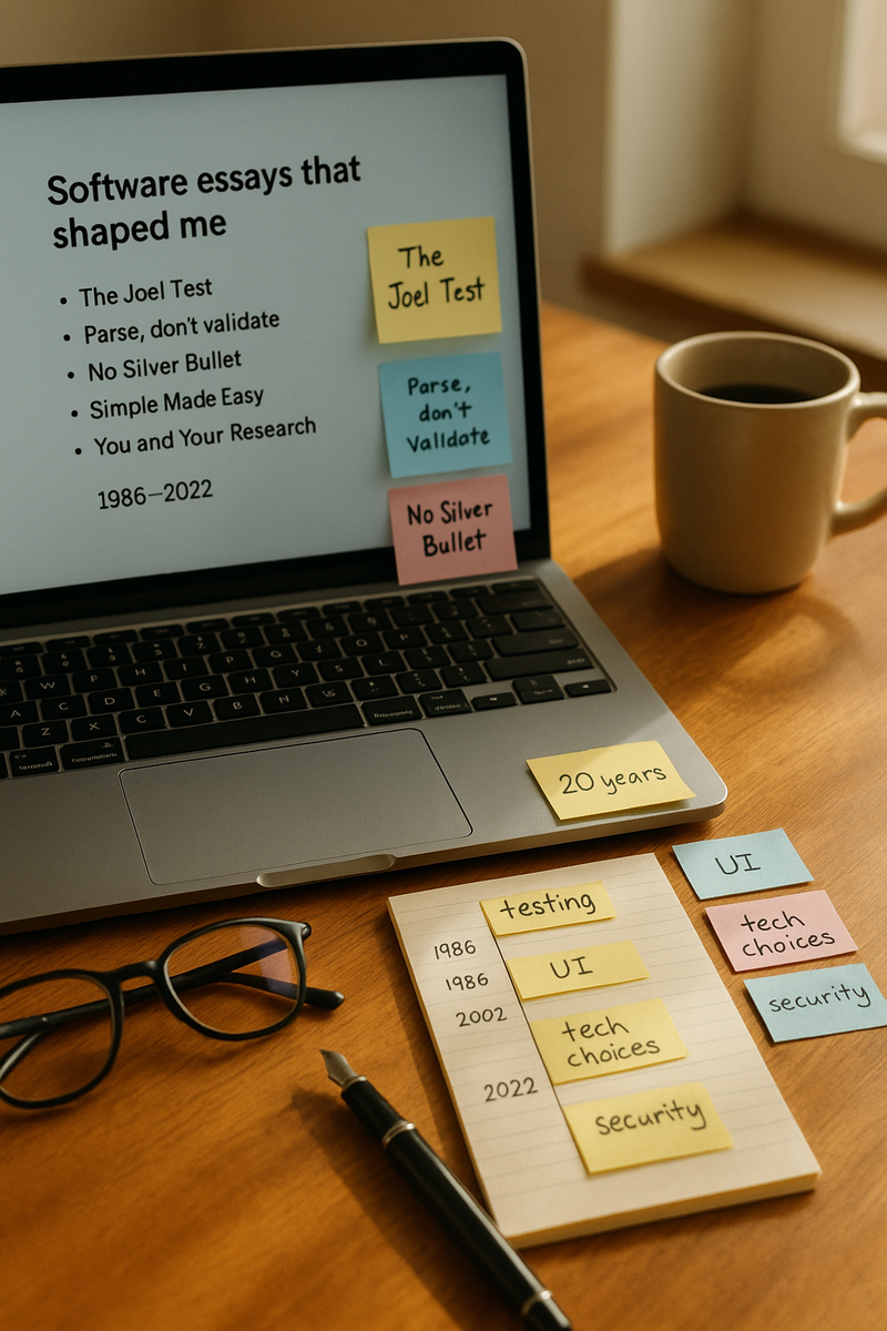 Недавно Майкл Линч опубликовал подборку эссе, которые повлияли на его карьеру и подход к разработке ПО. В списке — от классики Фреда Брукса и Джоэла Спольски до свежих заметок про безопасность и выбор технологий. Интересно то, что эти тексты охватывают почти 40 лет истории индустрии — от 1986 до 2022 года.