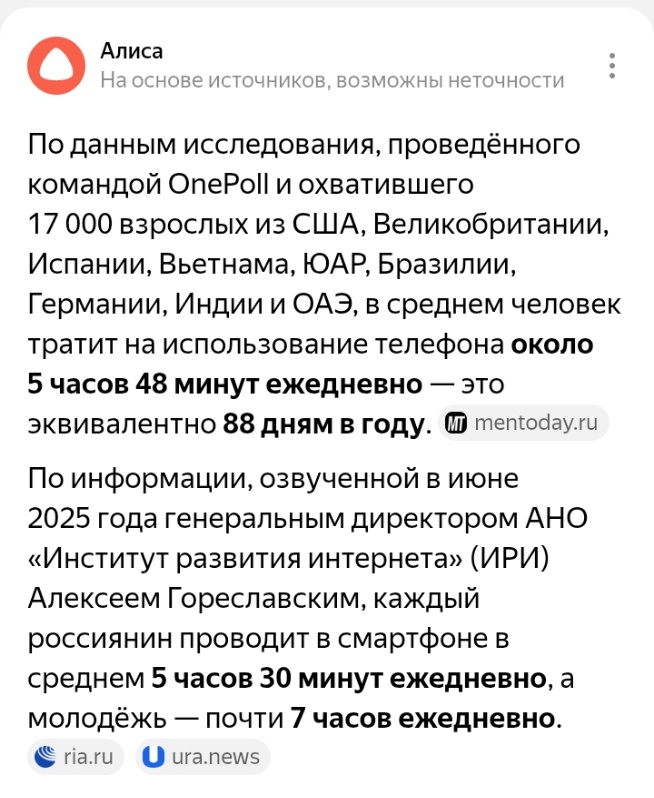 Есть у меня одно приложение мобильное, которое контролирует "экранное" время. Время, которое я провел в телефоне. Работа в приложениях, в интернете, мессенджерах и проч. Выставил себе ограничение в 1,5 часа. И каждый раз когда я получаю статистику за неделю, мне приложение напоминает, что в среднем пользователи тратят на телефон 5 часов 30....45 минут ежедневно. Думаю, что это очень показательная цифра. Это фактически половина, даже больше, рабочего дня Время, наглядно показывающее насколько плотно и глубоко проникли гаджеты в нашу жизнь. Забирая драгоценное время, энергию и внимание, которое можно было бы потратить на что то более важное, ценное Выше картинка из запроса ИИ и данные приблизительно те же. Больше 5-ти часов проводит человек в телефоне В большинстве случаев, бесцельно потраченное время половина активного дневного времени. Бесценного Всем хорошего продуктивного дня Ваш, доктор Постников