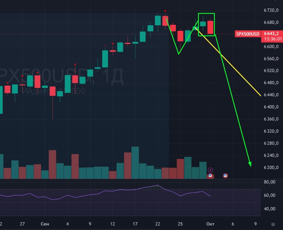 📈 Индекс S&P500 🟢Обычно сентябрь - слабый месяц для американского индекса, но в этот раз он оказался самым сильным среди сентябрей за 7 лет. Так что не грех в октябре завалиться, тем более шатдаун уже стартовал. 🟢 На дневке был первый импульс с высоким отскоком, на вершине отскока сегодня рисуется медвежье поглощение. #SP500 #Nasdaq #SPY #SPX #SPYF #рынок #сиплый #прогнозрынка #макро #bogdanoffinvest