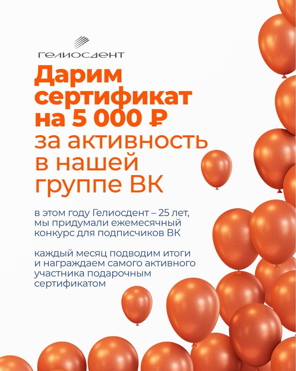 Хотите получить сертификат на 5 000 ₽ в стоматологию «Гелиосдент»? Мы запустили ежемесячный конкурс в нашей группе ВКонтакте! Условия очень простые: — Будьте активными в сообществе: ставьте лайки, пишите комментарии, участвуйте в опросах, оставляйте отзывы и приглашайте друзей. — За каждое действие начисляются баллы. — Каждую неделю публикуем рейтинг, а 1 числа нового месяца объявляем победителя! 🏆 Приз — сертификат на 5 000 ₽ в Гелиосдент. Присоединяйтесь прямо сейчас 👉 https://vk.com/geliosdent_ekb