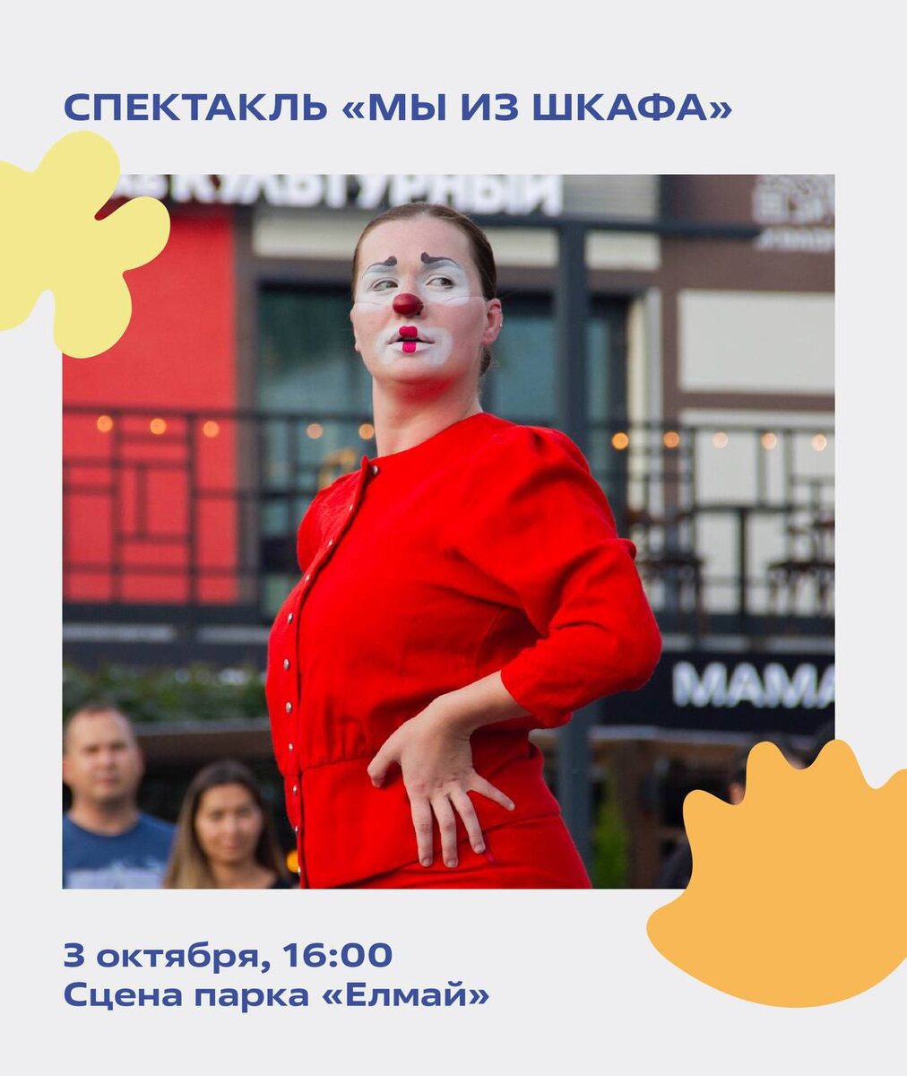3 октября спектакль в жанре клоунады «Мы из Шкафа» от Руслана Риманаса. Постановка, где два клоуна не просто переодеваются — они пробуют жизнь на вкус: с улыбкой, трепетом и замиранием сердца. Меняются не только их образы, но и времена, характеры, настроения. Спектакль, в котором не задают вопросов, но находят ответы. В 16:00 у сцены парка «Елмай» @kazandetki Больше информации в нашей группе, переходите