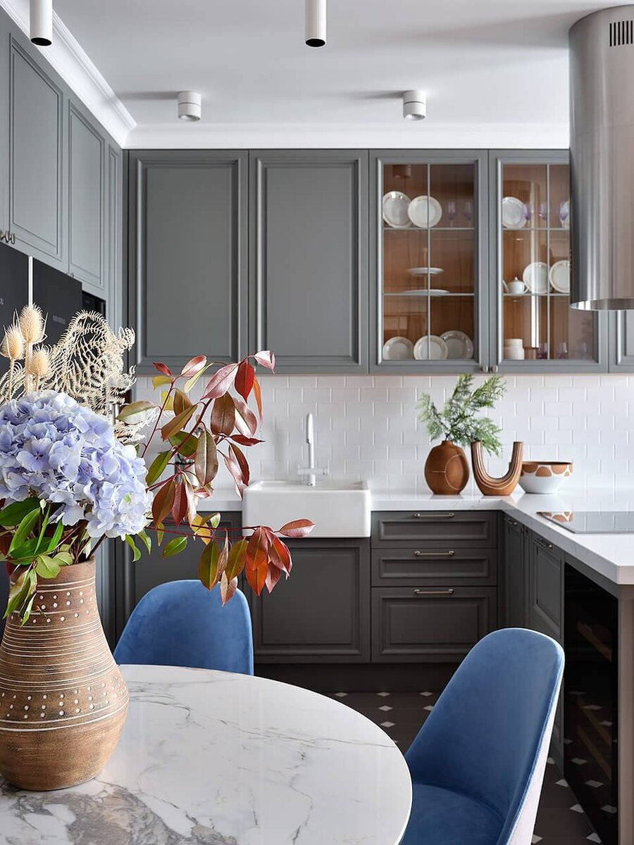 Представьте кухню, где каждая деталь работает на настроение 🌿. Глубокие серые фасады подчёркивают изысканность, мраморная столешница добавляет лёгкого шика, а бархатные стулья делают пространство по-настоящему уютным. Атмосфера свежести, благодаря живым цветам и природным акцентам 🌸✨. Здесь хочется не просто готовить…здесь хочется жить красиво. 💭💎 Хотите, чтобы ваша кухня тоже вдохновляла каждый день? Подробности: 🔸Материал фасадов: МДФ Эмаль 🔸Размеры: длина верхних верхних шкафов 3300, глубина 570 🔸Высота: 1135 🔸Длина нижних модулей 3060, глубина 600 🔸Высота: 870 🔸Общая высота 2645, общая ширина 3300 🔸Фурнитура: Blum 🔸Ящики Movento 🔸Лоток для приборов 🔸Подсветка врезная алюминиевая+ механический включатель Менеджер: Имарова Елена Дизайнер Резеда Рахматуллина 🌹 У нас в студиях выставлено множество образцов кухонь с разными системами, где можно всё посмотреть👀 Но не забудьте записаться ☺️ Наши адреса в Москве: 📍Дмитровское шоссе 71В, БЦ 7ONE, ежедневно с 10 д