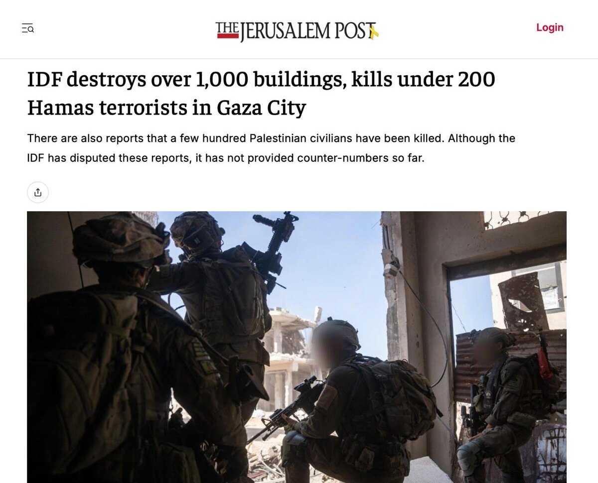 Армия обороны Израиля разрушила около 1 250 зданий в городе Газа с августа. При этом, как сообщила газета The Jerusalem Post, военные ликвидировали менее 200 радикалов. Примерно треть разрушенных зданий классифицирована ЦАХАЛ в качестве полностью военных объектов, а половина — как объекты вторичного использования радикалами, например, в части из них были установлены камеры наблюдения. При наличии хотя бы одной камеры наблюдения все многоэтажное здание может быть снесено, сообщил изданию источник из ЦАХАЛ.