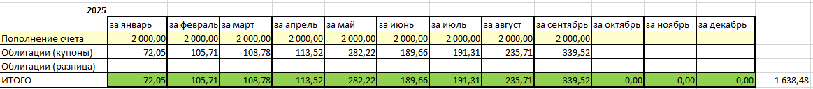 Сентябрь побил рекорд по купонам, пришло 339,52 руб. А всего за этот год доход составил 1 638,48 руб.