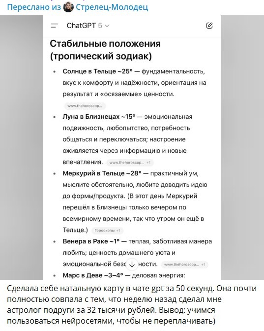 «Сделала себе натальную карту в ChatGPT за 50 секунд. Она почти полностью совпала с тем, что сделал астролог за 32 тысячи. Вывод: учимся пользоваться нейросетями, чтобы не переплачивать».