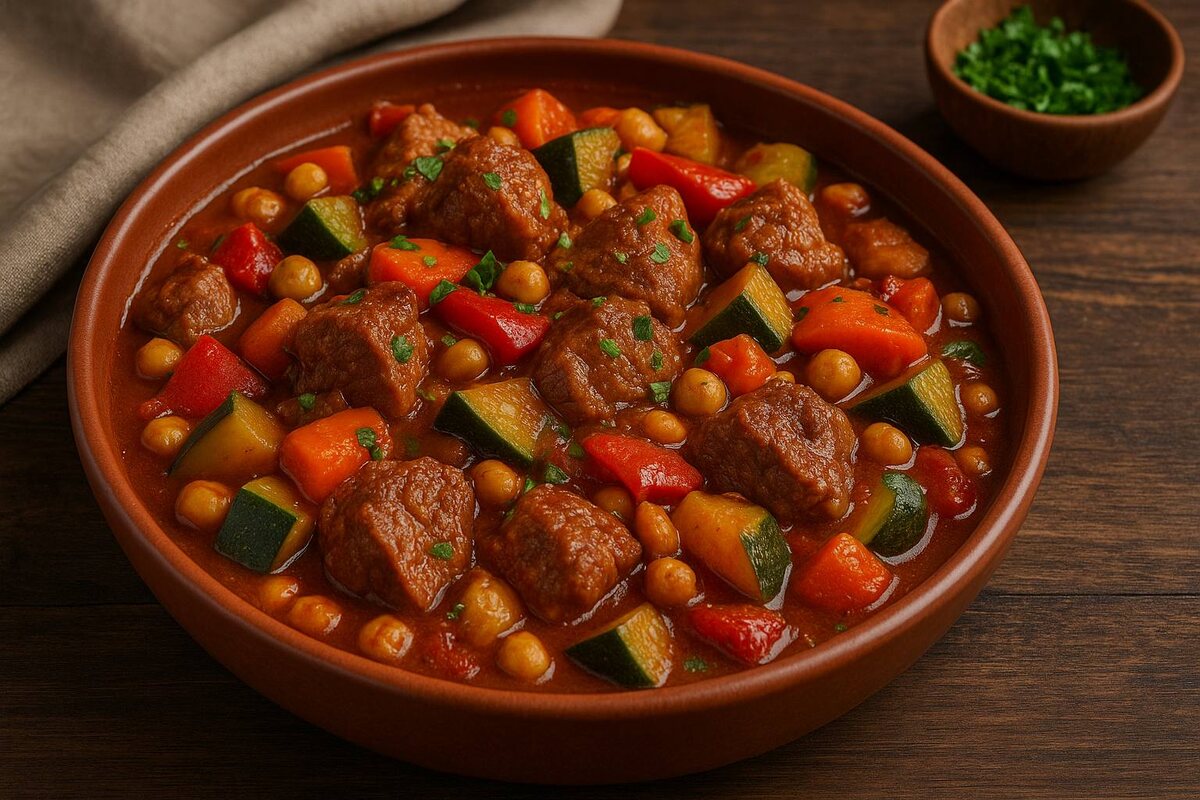Привет, это снова Папа у плиты! Знаете, бывают такие вечера, когда хочется не просто накормить семью, а устроить что-то необычное, словно маленькое путешествие. Обычно я беру проверенные рецепты — супы, запеканки, котлеты. Но сегодня захотелось добавить в кухню восточного колорита. И если уж экспериментировать, то по-крупному: баранина в таджин-стиле с овощами и специями. Таджин — это не просто блюдо, это целая философия медленного приготовления. В Марокко для него используют специальную керамическую посуду с крышкой в форме конуса, но дома всё можно сделать и в обычном казане или глубокой толстостенной кастрюле. Главное не спешить: дать овощам и мясу обменяться вкусами, а специям — раскрыться полностью. Ингредиенты (на 4–5 порций): • Баранина (лопатка или голень без кости) — 800 г • Лук репчатый — 2 шт. • Морковь — 2 шт. • Болгарский перец — 1 шт. • Кабачок или цукини — 1 шт. • Помидоры — 2 шт. (или 200 мл томатного пюре) • Чеснок — 4 зубчика • Курага — горсть (по желанию) • Нут отва
