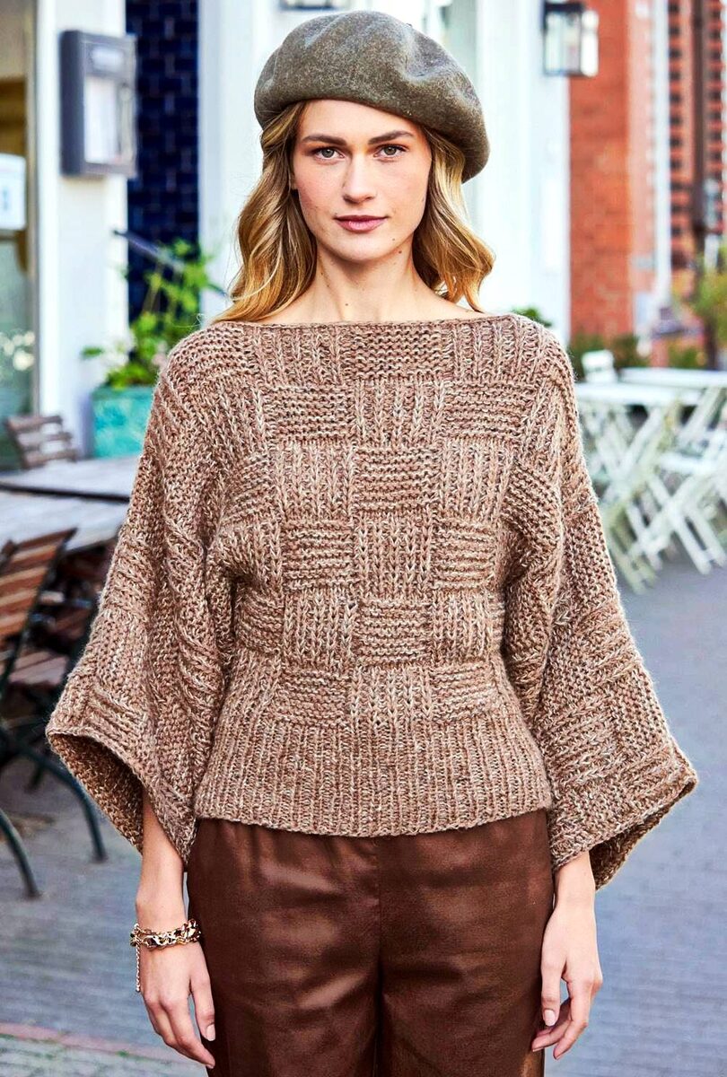№ 1: Коричневый пуловер с цельновязаным рукавом а-ля «летучая мышь» и клетчатым узором ♥