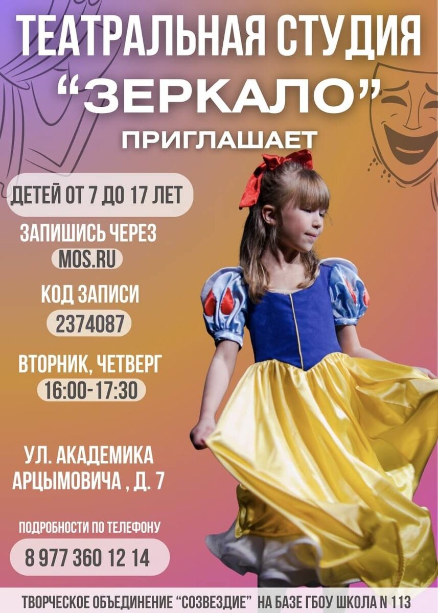 ✨ Дайте Вашему ребенку шанс засиять на сцене! ✨ 🎭 Бесплатный пробный урок актерского мастерства 2 октября в 16:00! 🎭 Мечтаете, чтобы ваш ребенок стал увереннее в себе, раскрыл свой творческий потенциал и научился выражать свои эмоции? Тогда театральная студия «Зеркало» ждет вас! Мы объявляем набор детей с 1 по 8 класс на занятия актерским мастерством, которые стартуют в октябре 2024 года! Почему именно «Зеркало»? • Раскрываем таланты: Помогаем каждому ребенку найти свою «изюминку» и развить актерские способности. • Разнообразные занятия: Спектакли, тренинги и игры – скучать не придется! • Развиваем личность: Учим быть яркими, артистичными, открытыми миру и, самое главное, самим себе! • Дружелюбная атмосфера: Создаем среду, где каждый ребенок чувствует себя комфортно и может свободно выражать свои эмоции. • Профессиональные педагоги Что вас ждет: • Занятия 2 раза в неделю по 1,5 часа (вторник и четверг с 16:00 до 17:30) • Удобное расположение: школа № 113 (ул. Академика Арцимов
