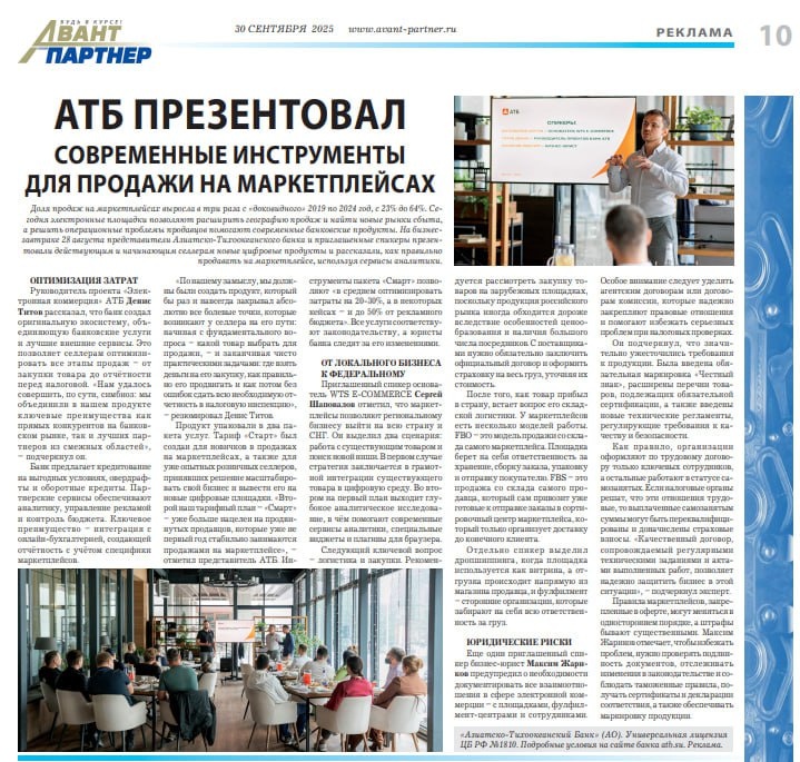 📰 Газетная волна добралась до нас! 🔥 WTS теперь в материалах АТБ: «От локального бизнеса — к федеральному» 💡 Главное за 30 секунд: наши клиенты уже экономят 20-50 % на рекламе с пакетом «Смарт»; 64 % продаж в РФ идёт через маркетплейсы — мы в этой цифре; юр-риски, логистика, выбор товара и отчётность — всё закрыто одним договором с банком. 📈 Продолжение следует: новые фулфилмент-склады, Узбекистан и Киргизия в очереди на WB. Благодарим АТБ и всех спикеров — теперь официально на страницах газеты!