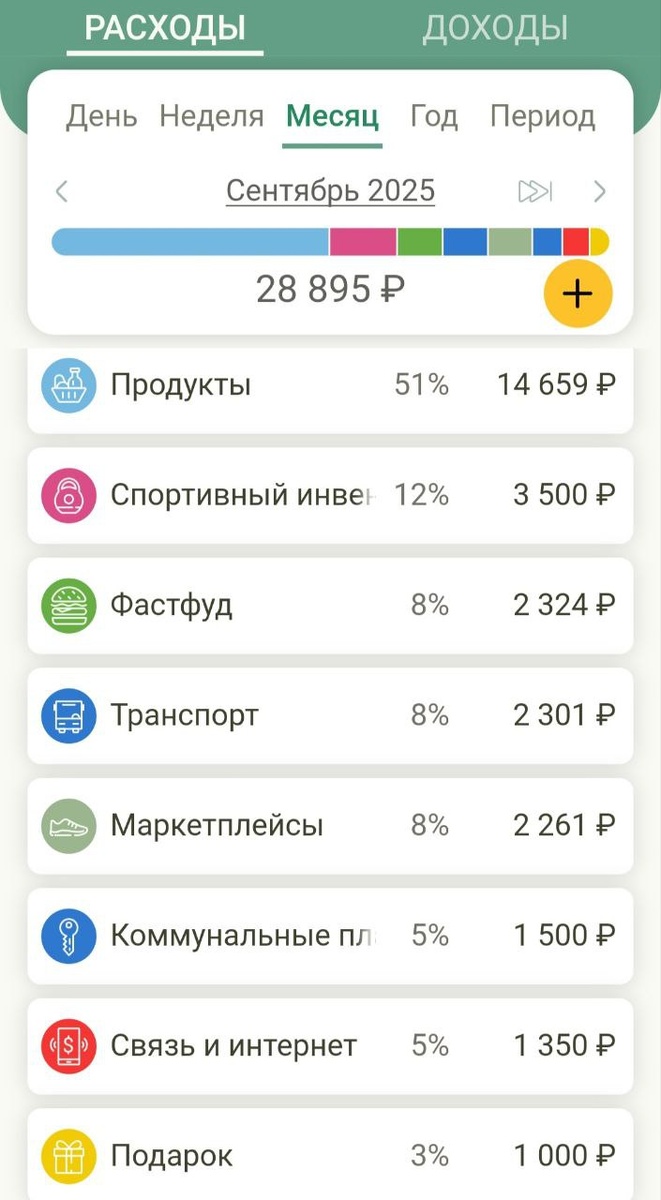 Расходы - Сентябрь 2025 год. —————————————————— Для меня не привычные расходы. Сам не ожидал, пересчитывая по каждой категории трат. Довольно много было доставки продуктов, покупки на маркетплейсах, начал покупать спортивный инвентарь - на данный момент гантели. Первый месяц в квартире. Привыкал к новому району. Дома провожу меньшую часть времени. Решил вопрос с работой (о ней расскажу позже), также после нее сразу мчусь в университет. График довольно плотный. Приходится распределять каждую минуту, чтобы не забывать о ежедневной рутине, привычках, тренировках.