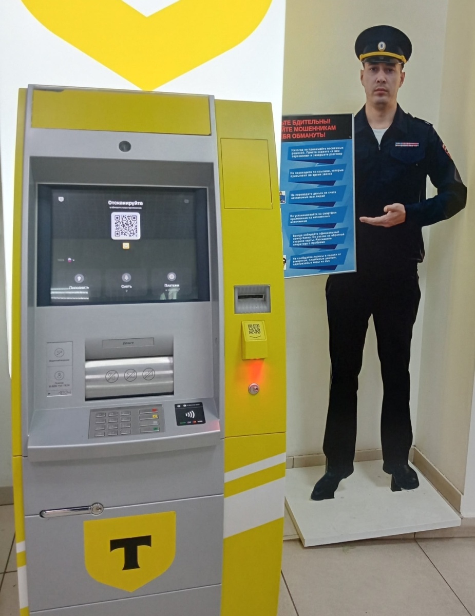 Картонный полицейский у банкоматов предупреждает о мошенниках