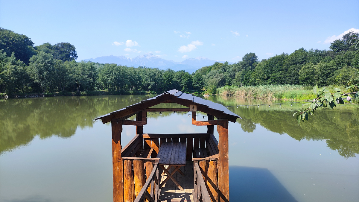 Прямая, как стрела, дорога Урванского района КБР, бесконечные яблочные сады, и вот мы на окраине Аушигера. Аушигер славится своим термальным комплексом, здесь выходят горячие источники. Я вообще обожаю все эти термалки. Но когда на улице за +35°, купаться что-то в горячей воде совсем не хочется.