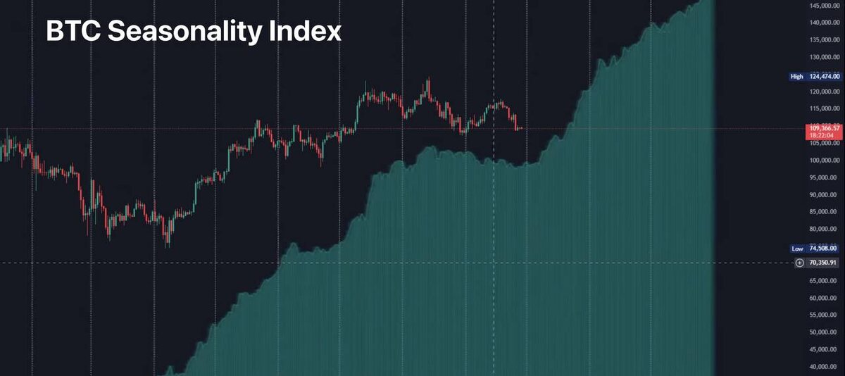 Сезонность биткойна снова работает Забавно: в мае медведи напирали на «sell in May and go away» — и что в итоге? Биткойн сделал новый ATH в конце мая и ещё дальше протянул вверх. Теперь та же публика вдруг решила «забыть» про сезонность, когда она снова указывает на бычий сценарий. Зелёная зона на графике — это усреднённая сезонность за всю историю BTC. Каждый раз в этом окне рынок формировал квартальное дно и запускал самый сильный апсайд-импульс года. На что стоит обратить внимание: — сезонность — не магия, а повторяющийся паттерн в цикле ликвидности; — сейчас окно для формирования локального лоу уже открыто; — исторически именно отсюда биткойн делал мощные рывки вверх. Игнорировать сезонность — значит спорить с историей. А история у биткойна упорно рифмуется. Хотите, я сделаю подборку по всем прошлым кварталам — где именно отрабатывала сезонность и какой апсайд она давала? Это поможет вам видеть закономерности там, где другим кажется «хаос». #биткойн #сезонность #цикл #рынок