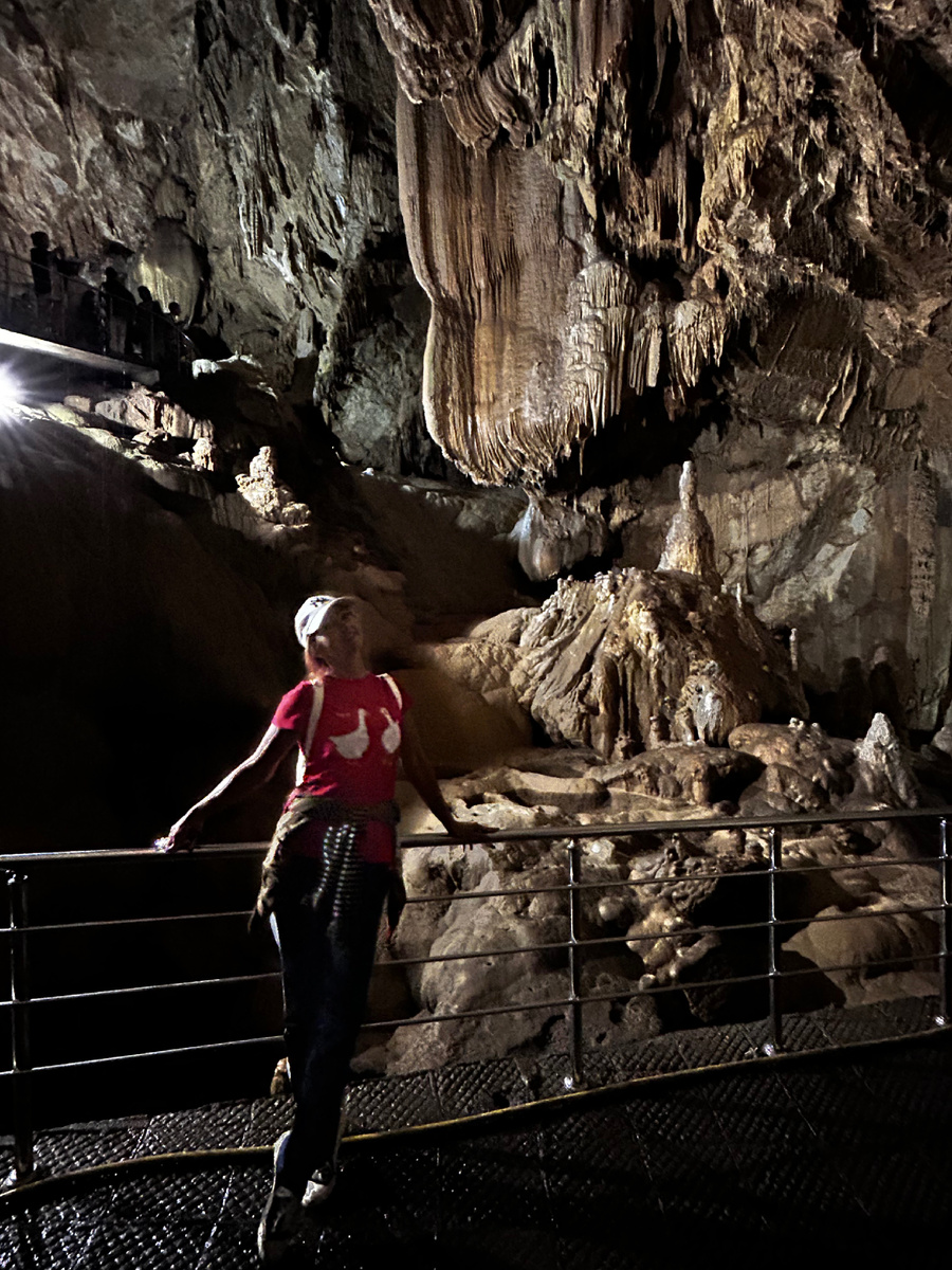 Ступив в прохладные недра подземелья, мы ахнули: вот это масштабы! Пещера Нового Афона открыла для нас всё своё величие. В первом зале, «Анакопия», притаились внизу два подземных озерца. Этот зал — самый глубокий из всех, его глубина аж 135 метров! Женщина-гид, явно любящая своё дело, рассказывает о том, как в 1961 году открыл это чудо природы местный житель, Гиви Смыр, спустившись именно сюда на глубину 40 метров (об этом я писала в прошлой статье). Здесь замечаем одну выдающуюся инсталляцию, которую создала сама природа: большой каменный череп. Её так и назвали - «голова Отапа». Веками складывалось это причудливое образование, чтобы сегодня мы, простые люди, удивлялись многообразию окружающего мира. Проходим дальше. Под ногами — влажные камни, ноги скользят. Держимся за поручни, благо всё здесь хорошо оборудовано. Свет в первом зале отключается, как только мы его покидаем — это регулирует наша гид, у которой в руках пульт. Попадаем во второе отделение — «Зал Махаджиров». Назв